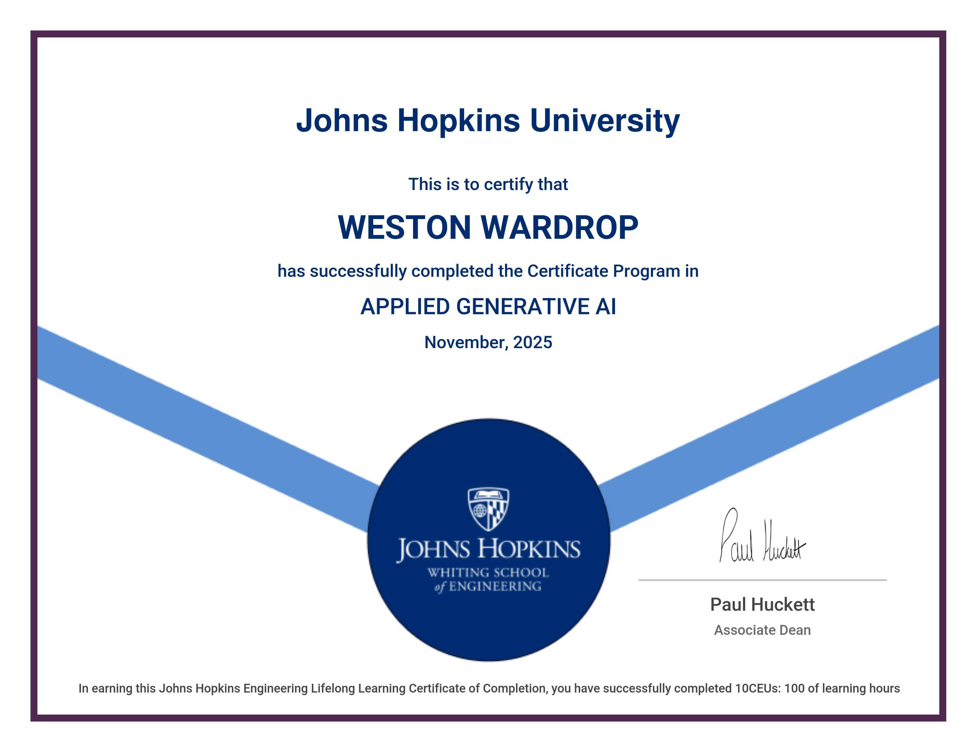 The certificate below verifies that WESTON WARDROP has completed the APPLIED GENERATIVE AI