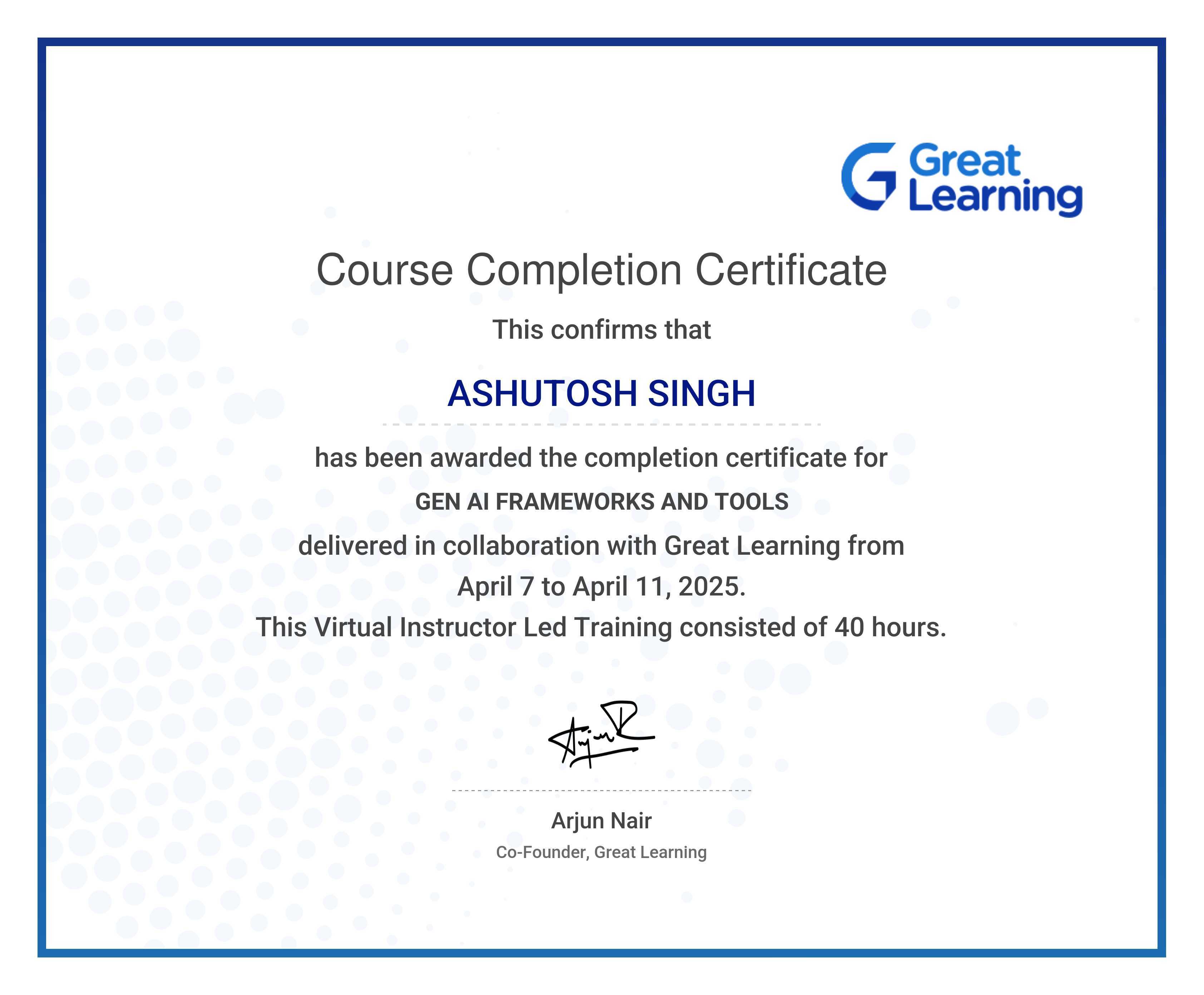 The certificate below verifies that ASHUTOSH SINGH has completed the GEN AI FRAMEWORKS AND TOOLS