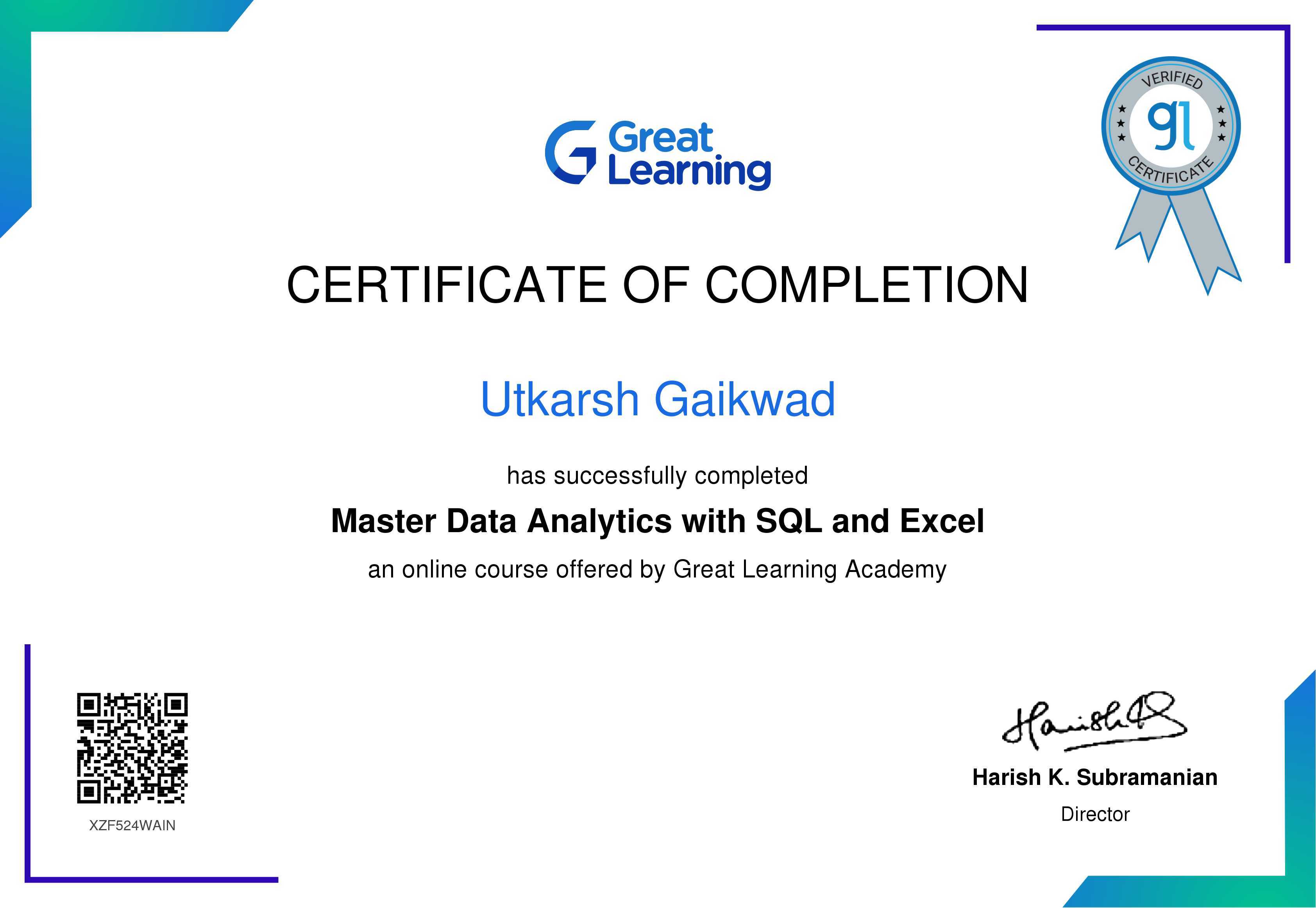 The certificate above verifies that Utkarsh Gaikwad has successfully completed the course Master Data Analytics with SQL and Excel