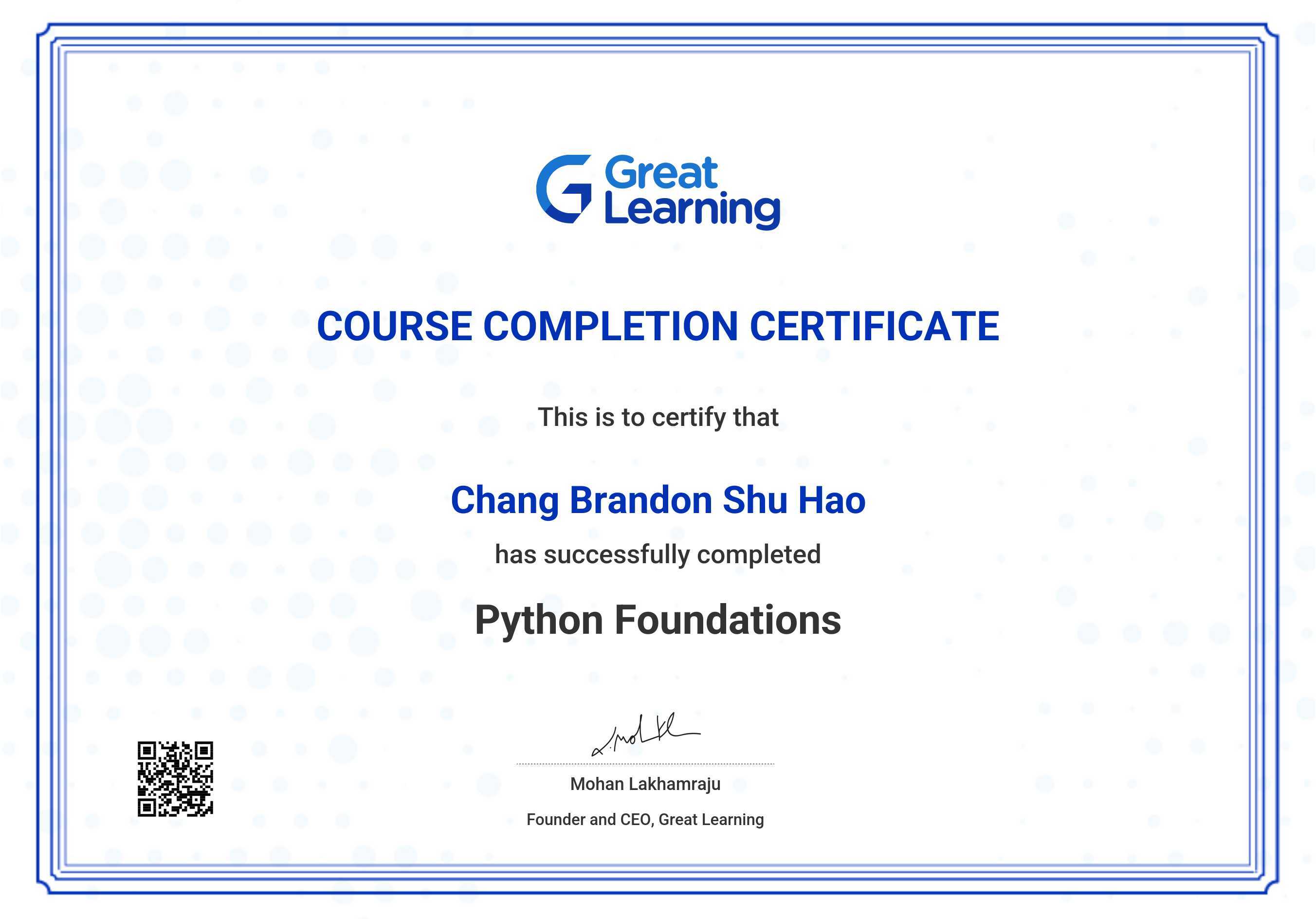 The certificate below verifies that Chang Brandon Shu Hao has completed the Python Foundations course