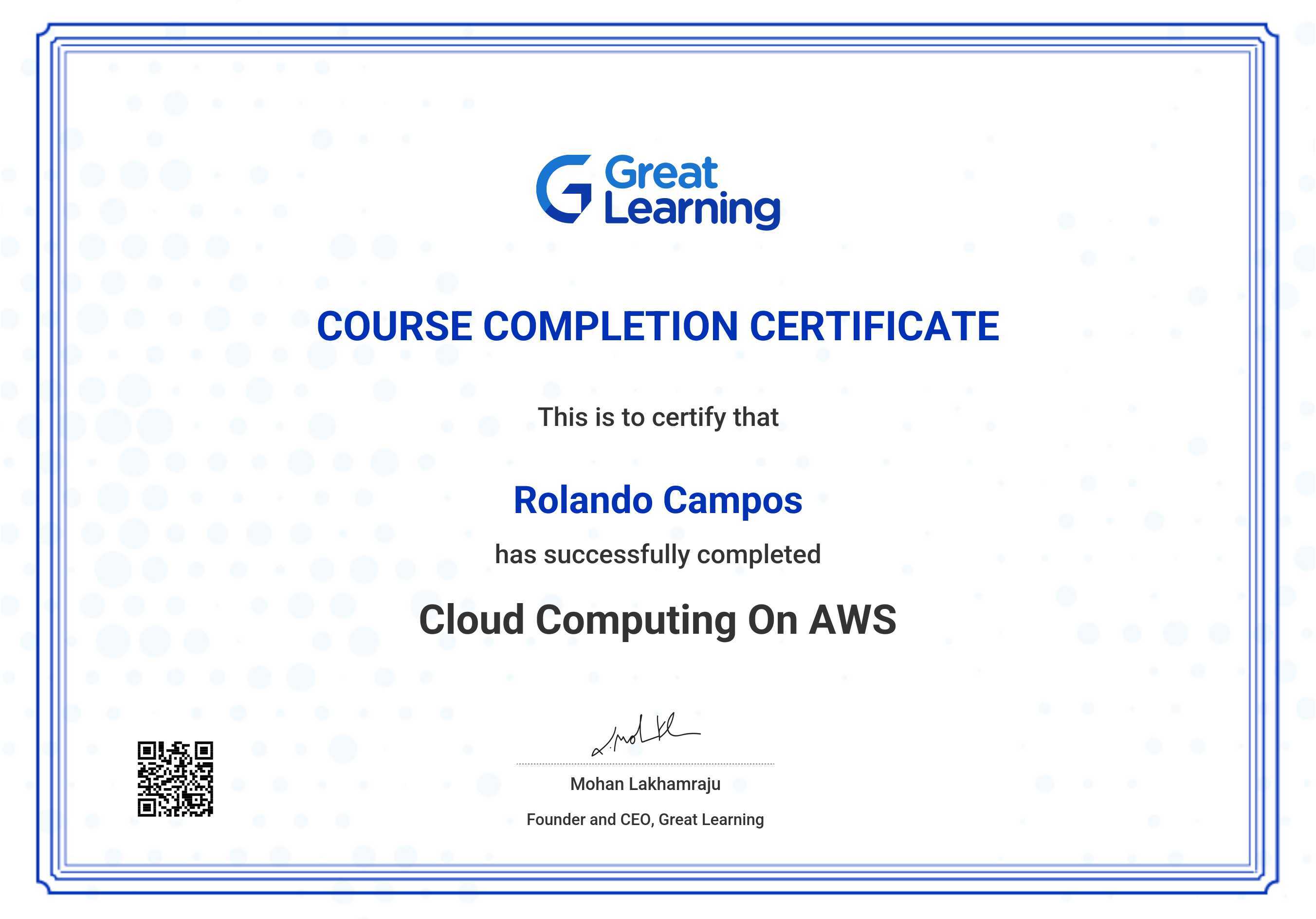The certificate below verifies that Rolando Campos has completed the Cloud Computing on AWS course