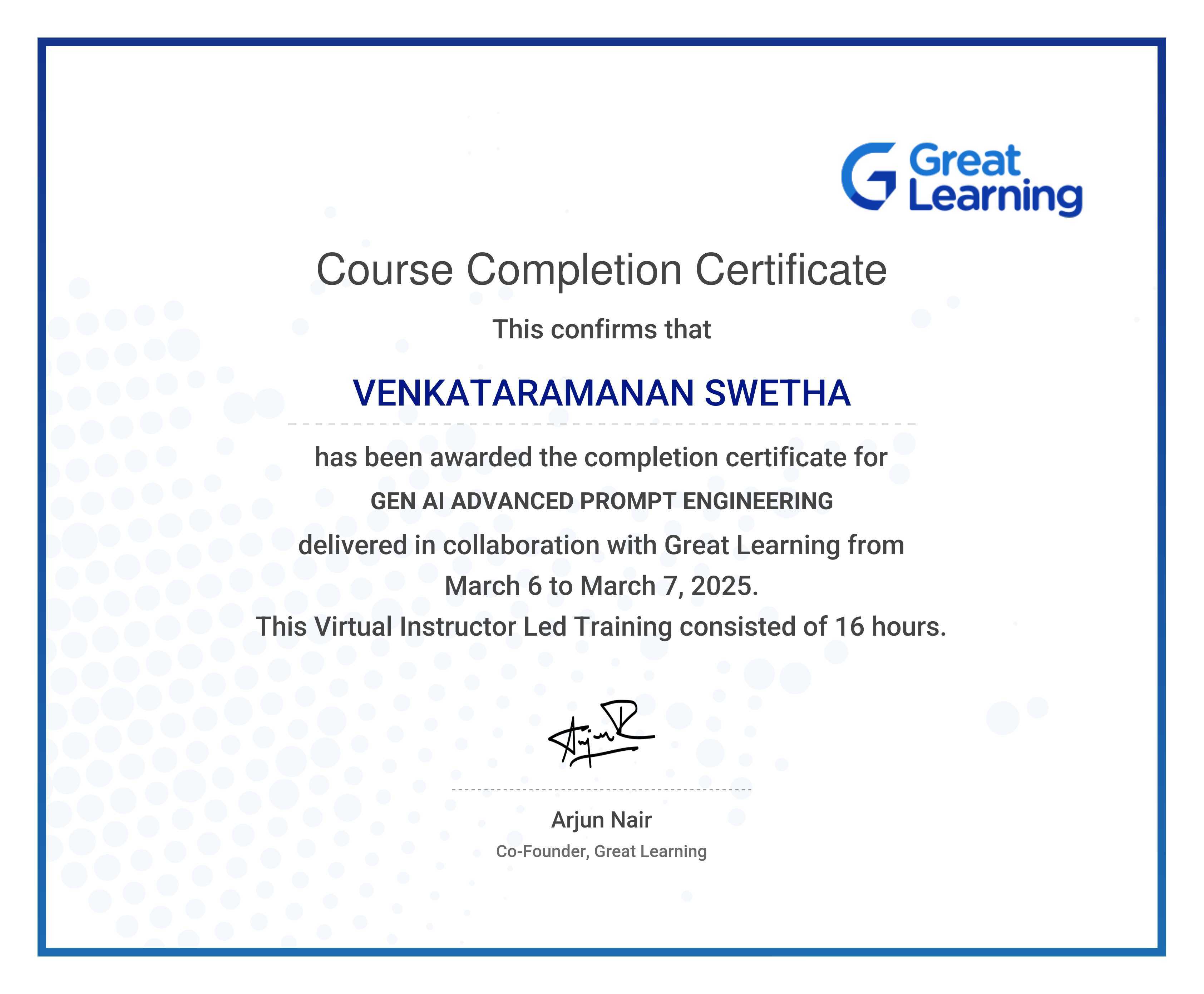 The certificate below verifies that VENKATARAMANAN SWETHA has completed the GEN AI ADVANCED PROMPT ENGINEERING