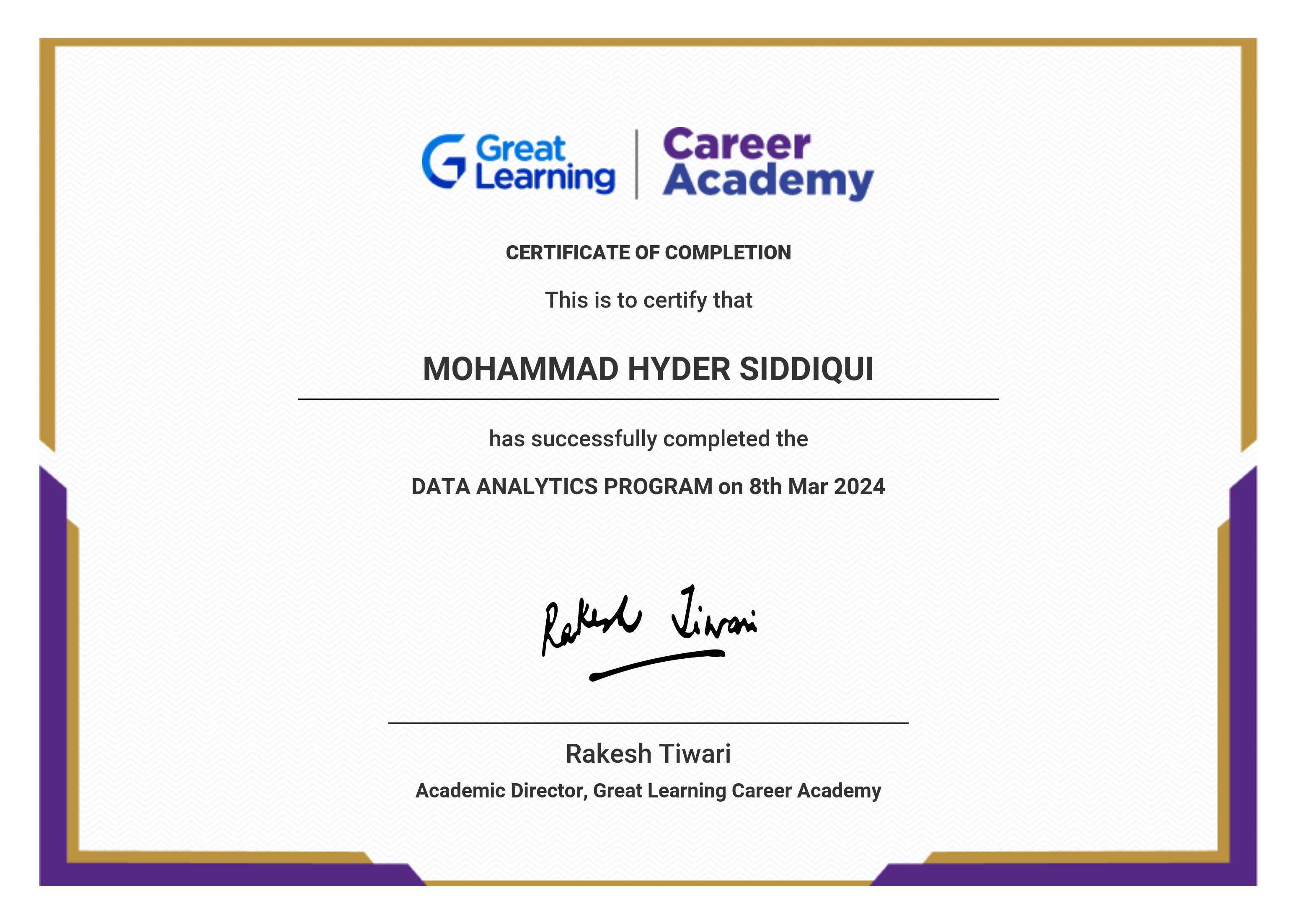 The certificate below verifies that MOHAMMAD HYDER SIDDIQUI has completed the DATA ANALYTICS PROGRAM