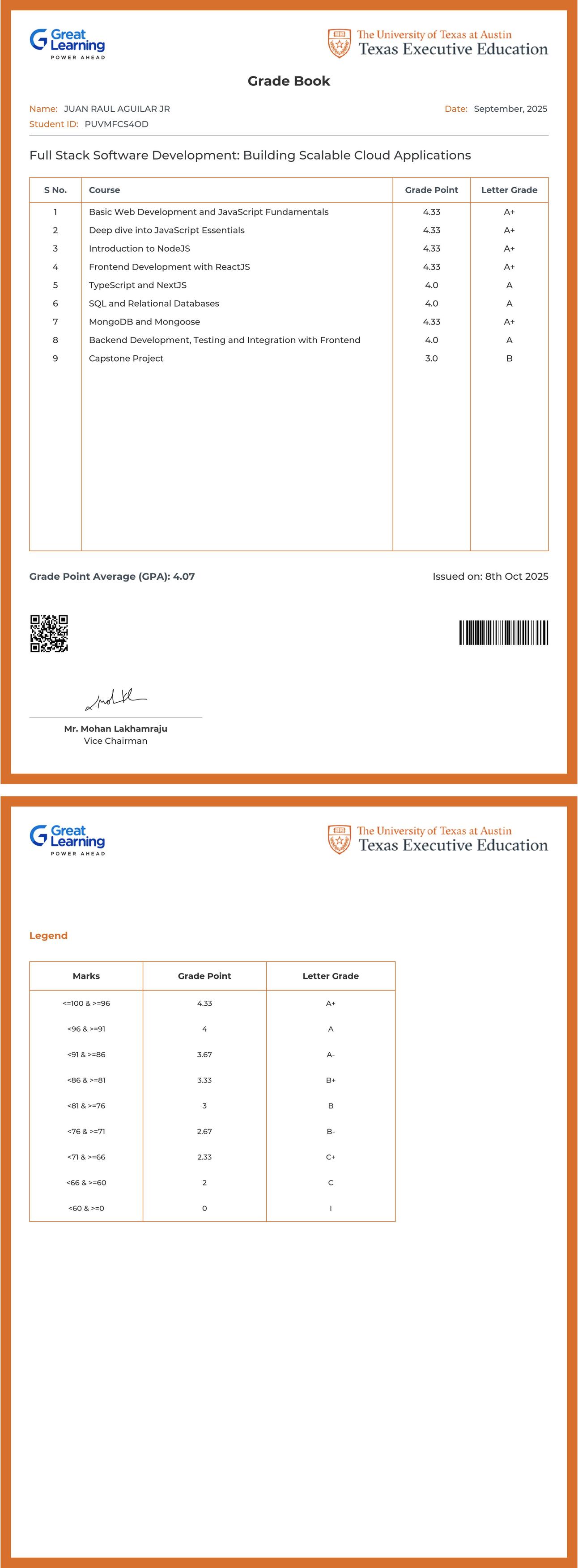 The grade sheet below verifies that JUAN RAUL AGUILAR JR has completed the FULL STACK SOFTWARE DEVELOPMENT: BUILDING SCALABLE CLOUD APPLICATIONS