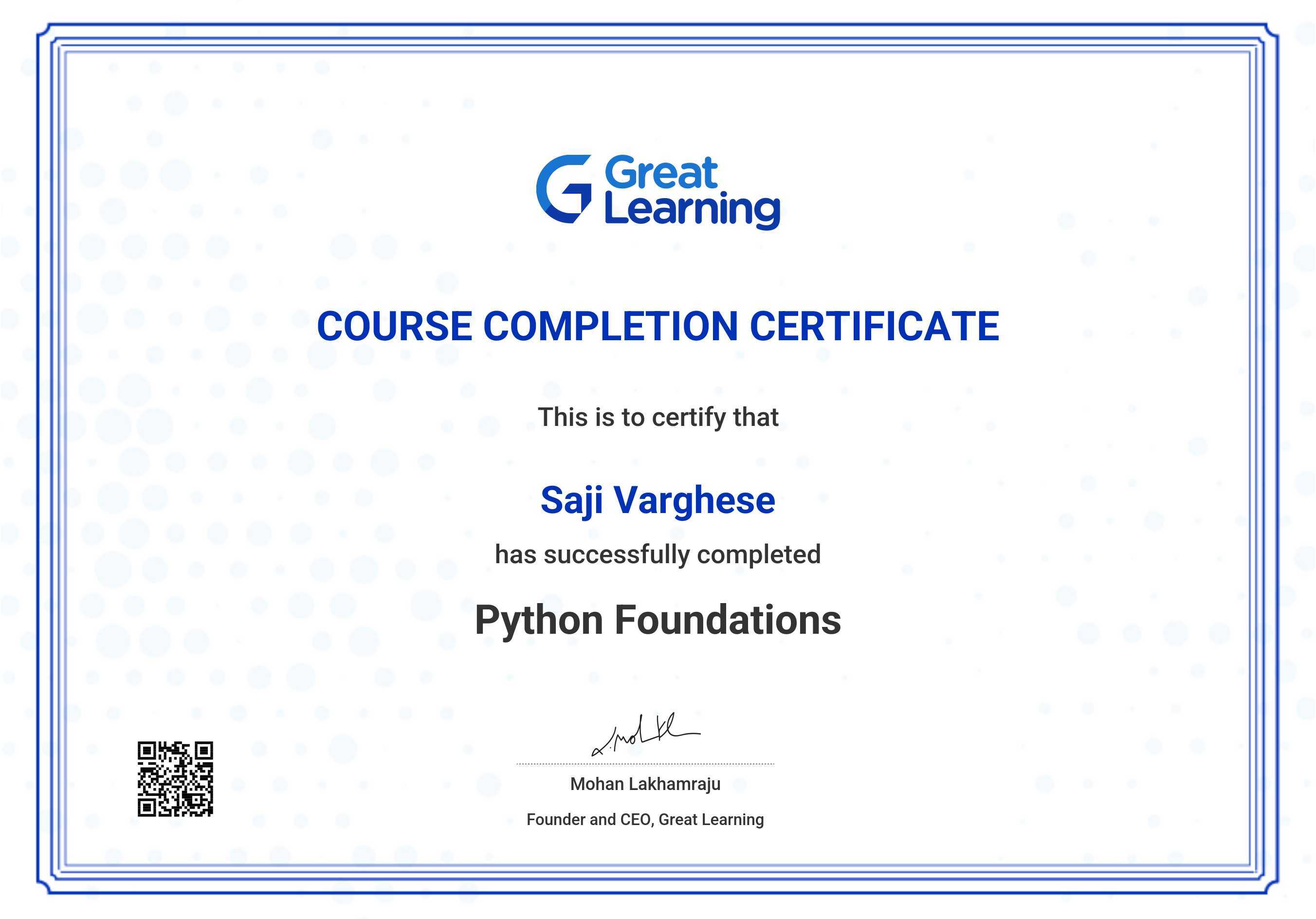 The certificate below verifies that Saji Varghese has completed the Python Foundations course