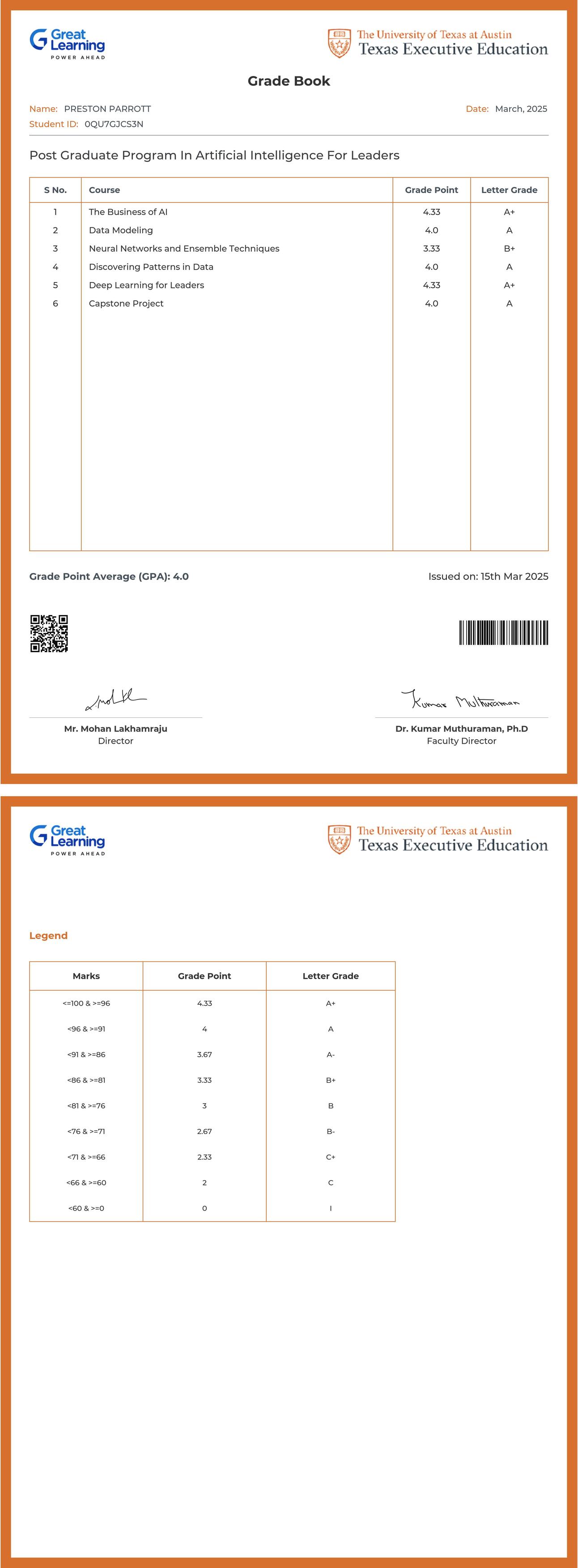 The grade sheet below verifies that PRESTON PARROTT has completed the POST GRADUATE PROGRAM IN ARTIFICIAL INTELLIGENCE for LEADERS