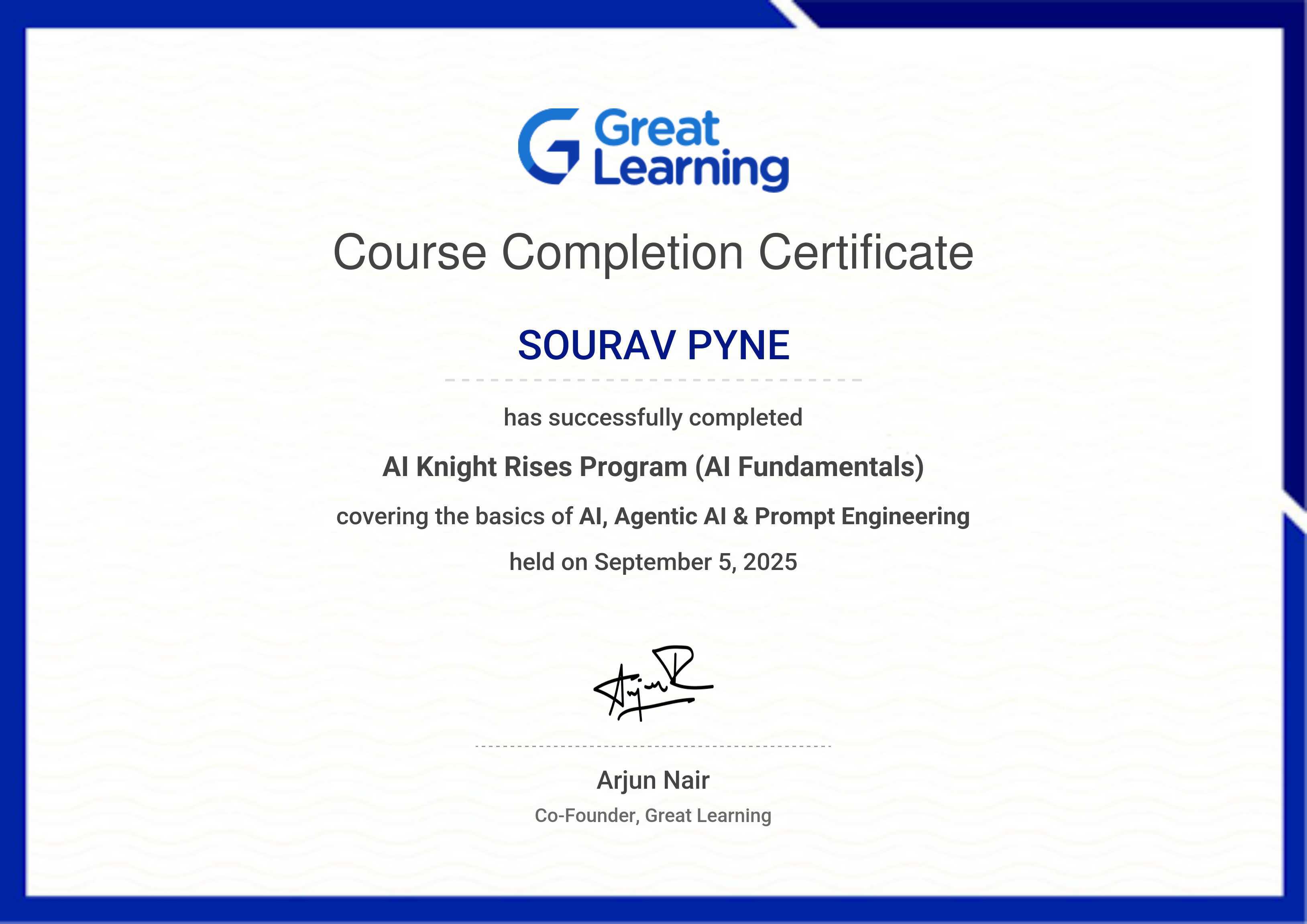 The certificate below verifies that SOURAV PYNE has completed the AI Knight Rises Program (AI Fundamentals)