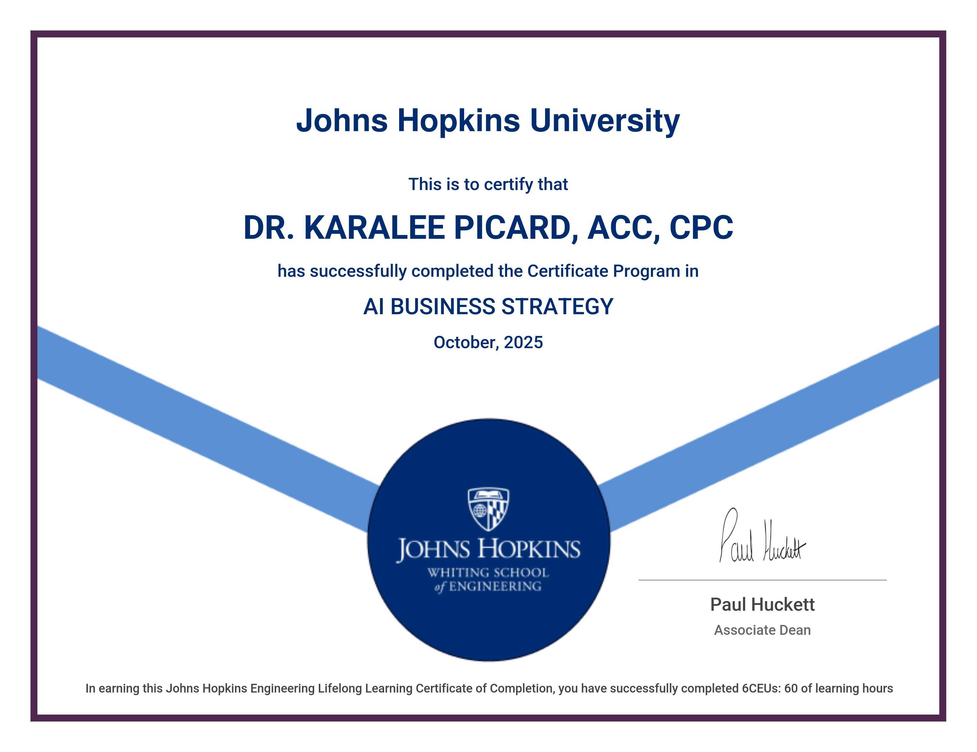 The certificate below verifies that DR. KARALEE PICARD, ACC, CPC has completed the AI BUSINESS STRATEGY