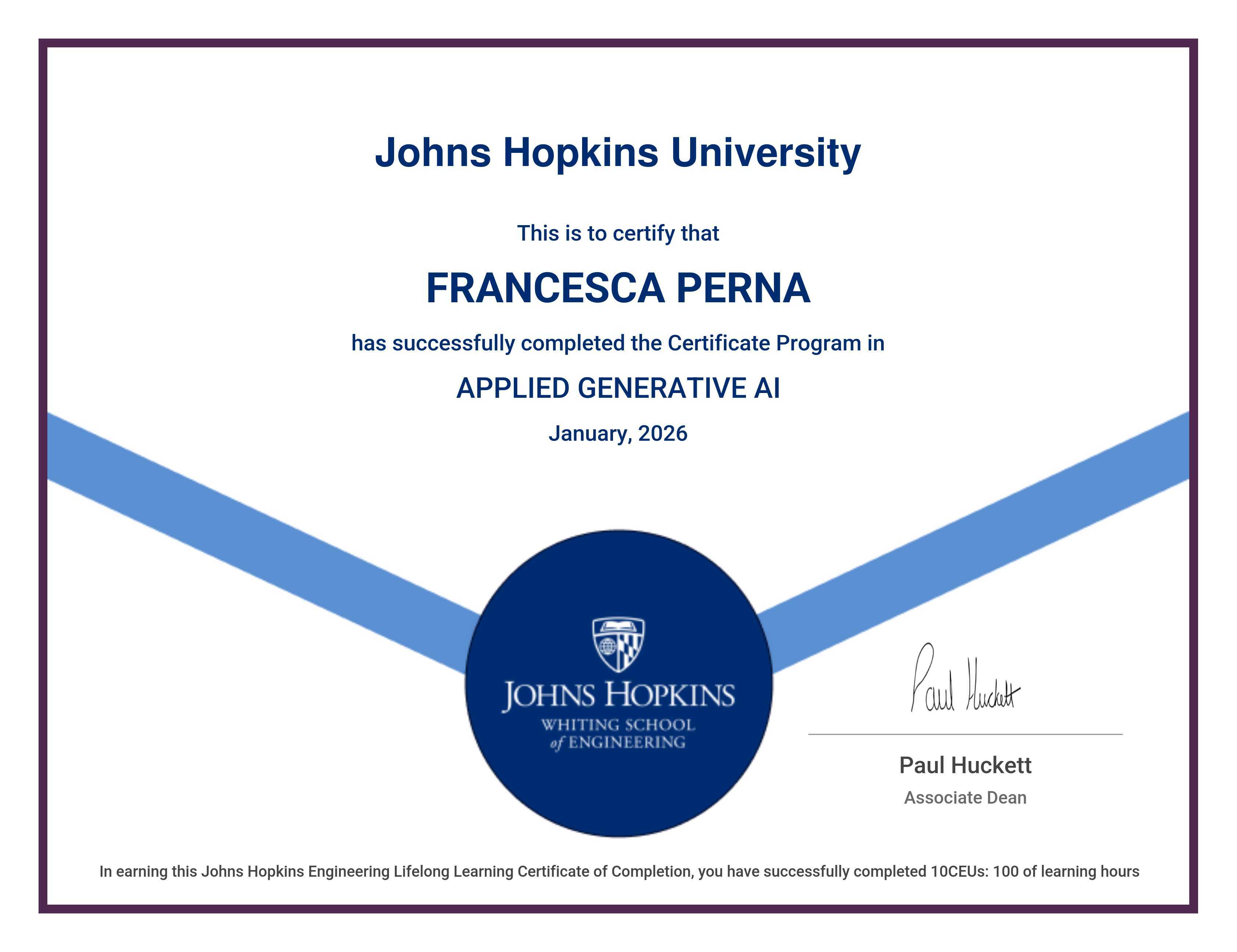 The certificate below verifies that FRANCESCA PERNA has completed the APPLIED GENERATIVE AI