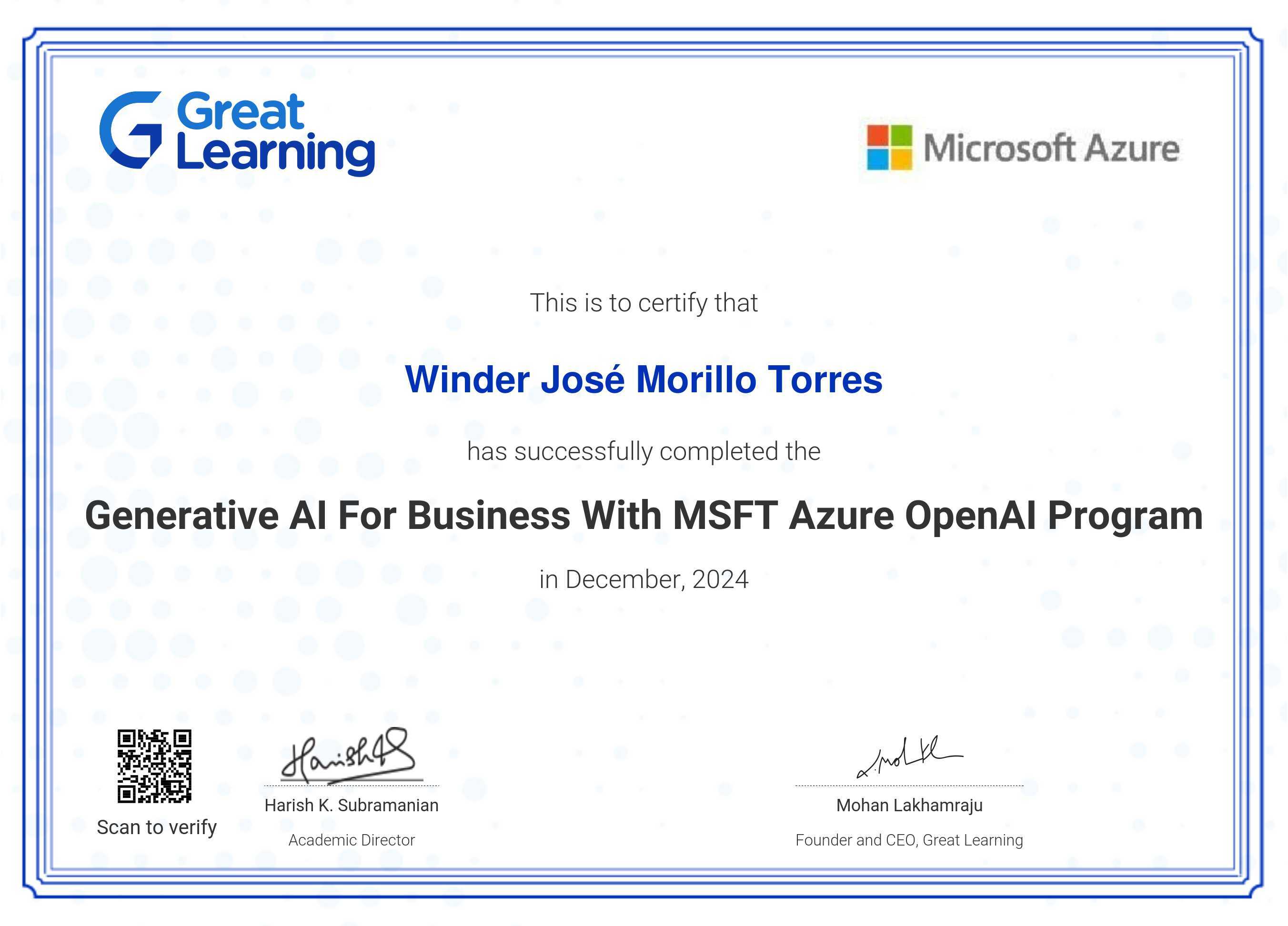 The certificate below verifies that WINDER JOSé MORILLO TORRES has completed the GENERATIVE AI FOR BUSINESS WITH MSFT AZURE OpenAI PROGRAM