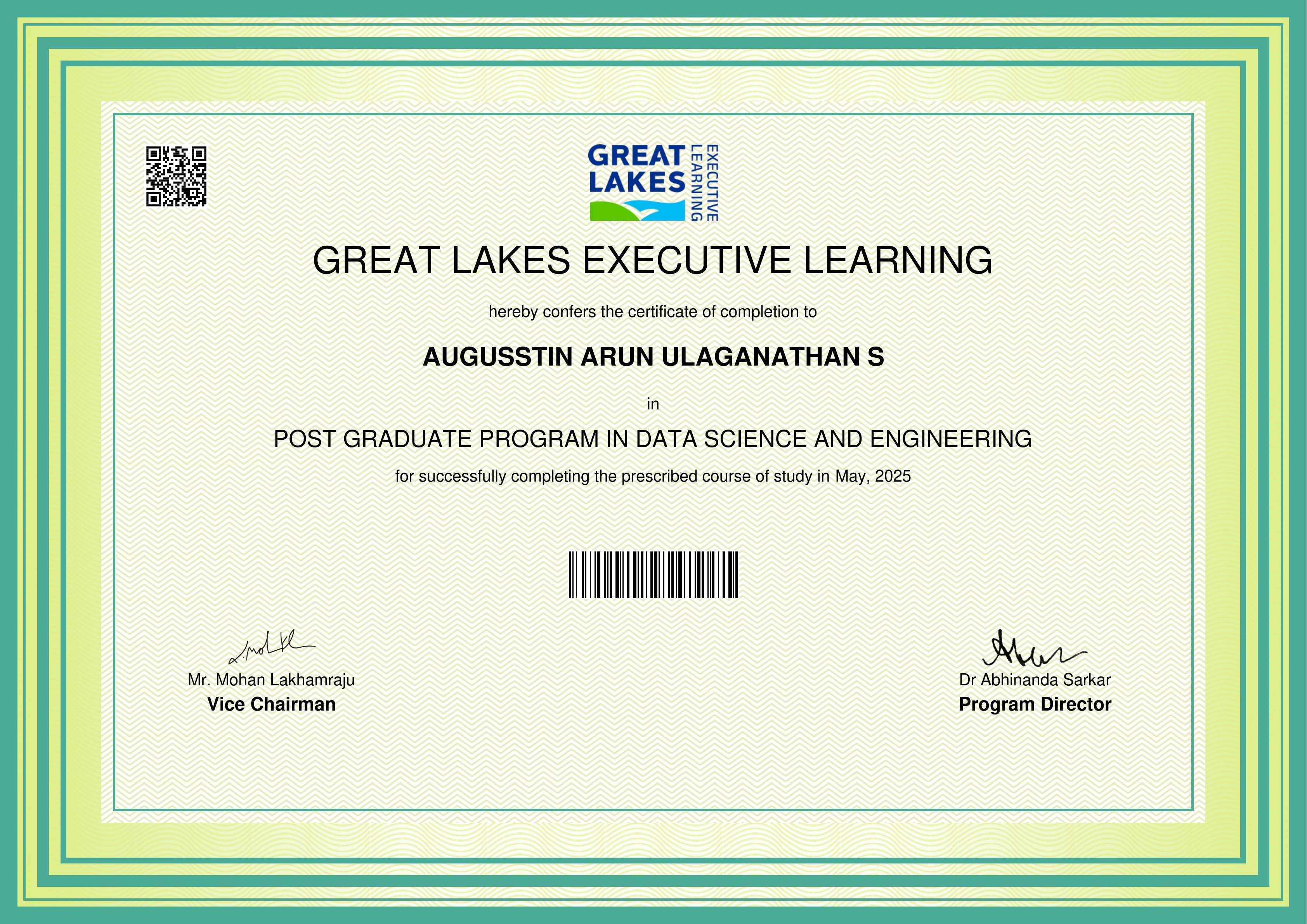 The certificate below verifies that AUGUSSTIN ARUN ULAGANATHAN S has completed the POST GRADUATE PROGRAM IN DATA SCIENCE AND ENGINEERING
