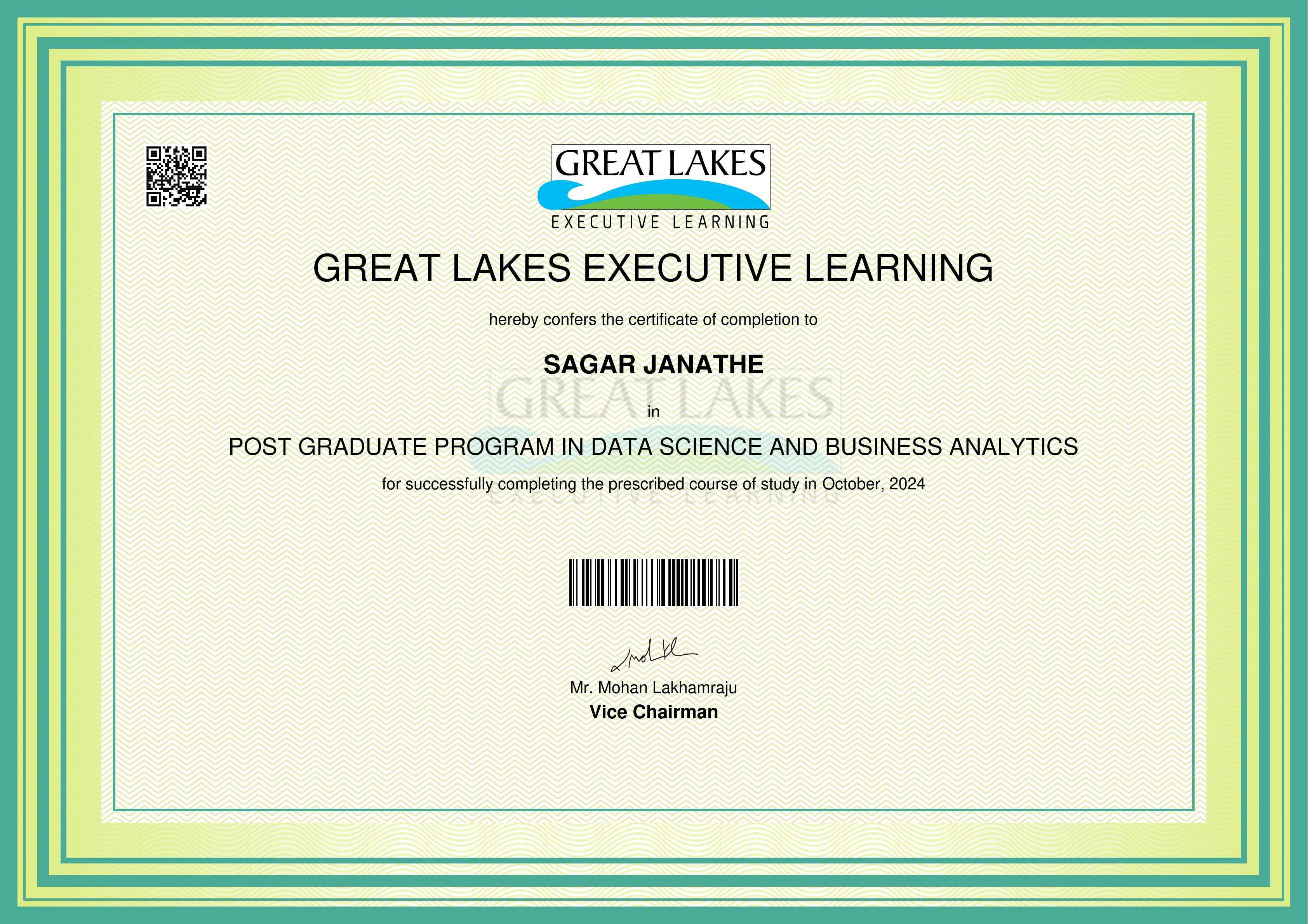 The certificate below verifies that SAGAR JANATHE has completed the POST GRADUATE PROGRAM IN DATA SCIENCE AND BUSINESS ANALYTICS