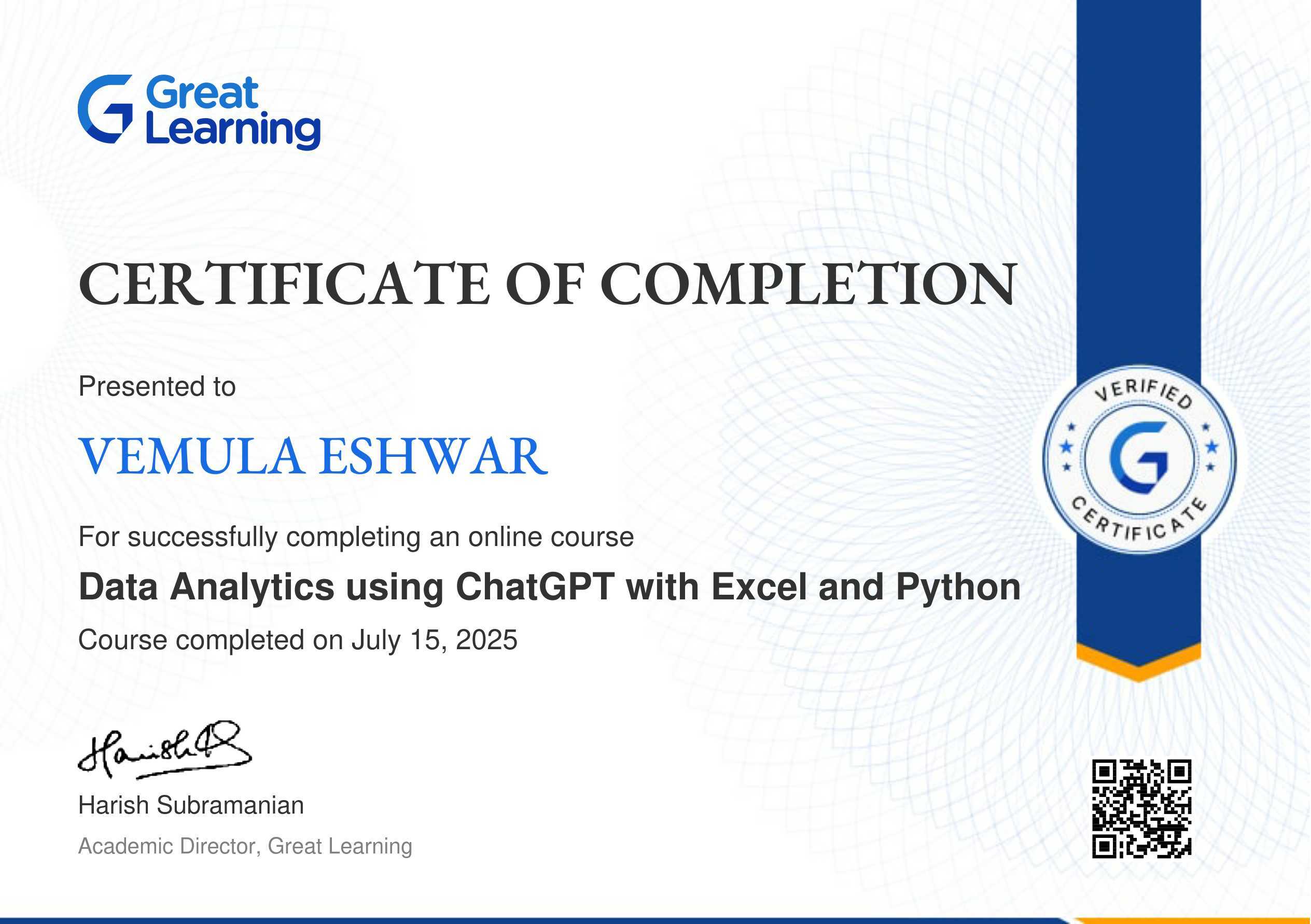 The certificate above verifies that Vemula Eshwar has successfully completed the course Data Analytics using ChatGPT with Excel and Python