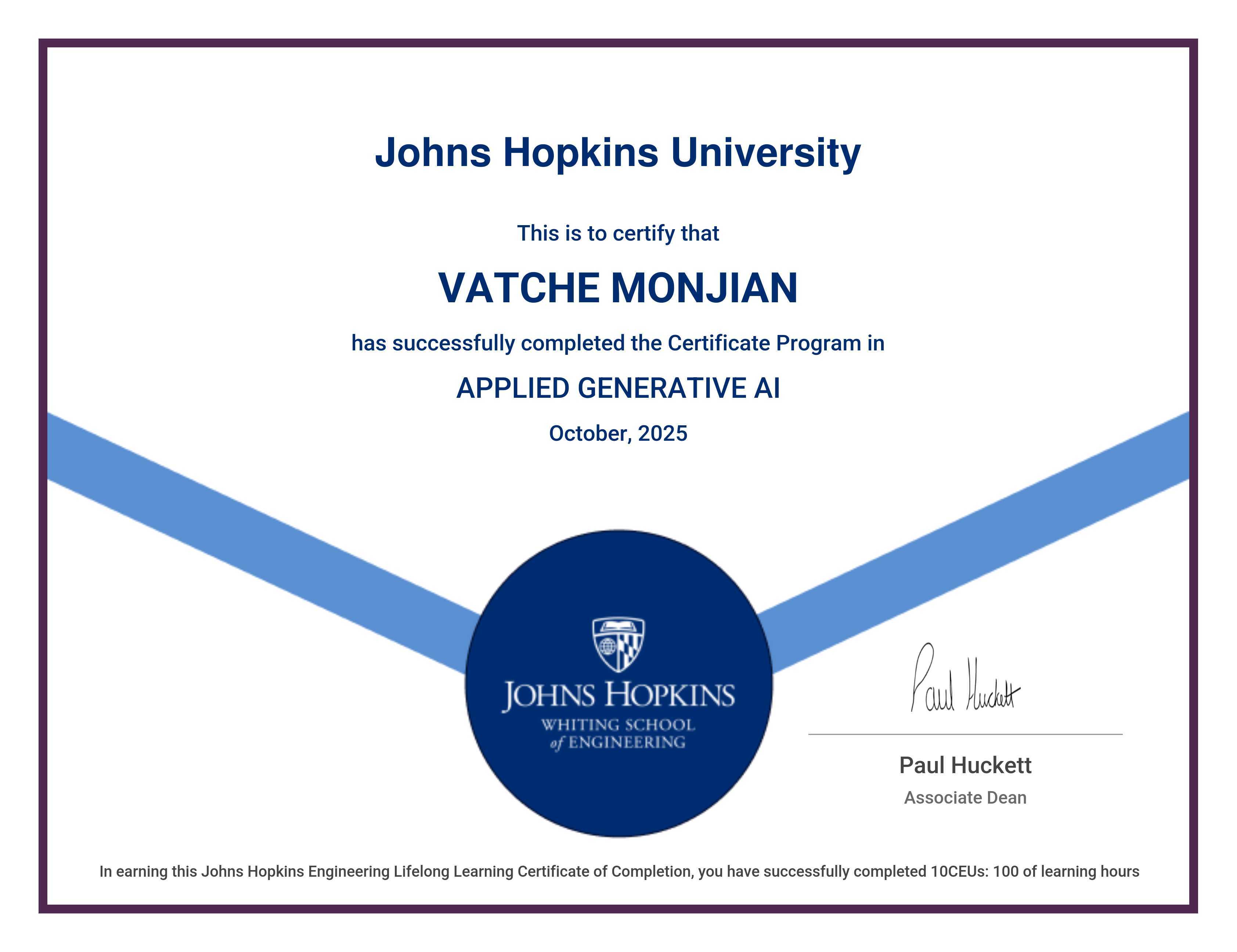 The certificate below verifies that VATCHE MONJIAN has completed the APPLIED GENERATIVE AI