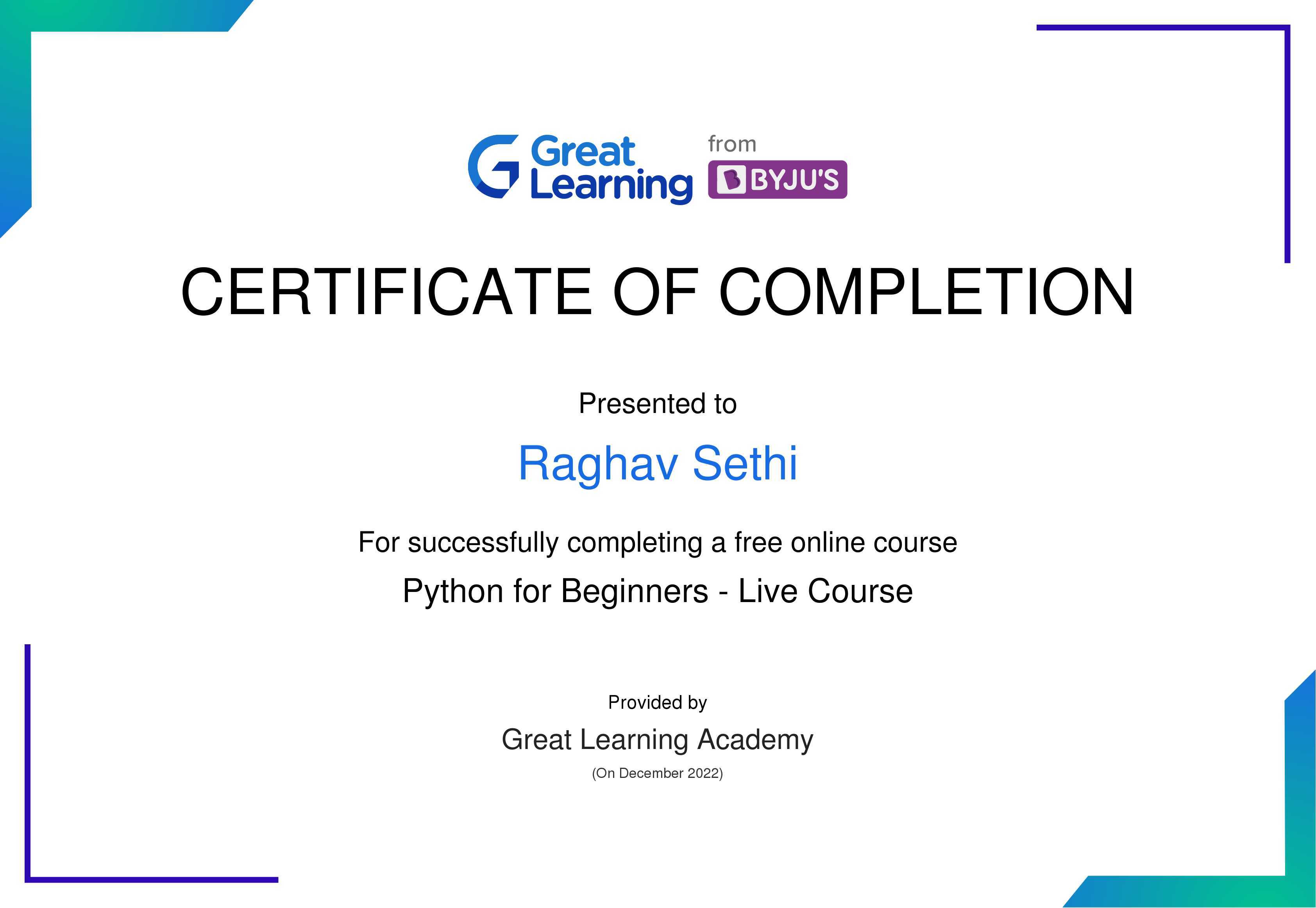 The certificate above verifies that Raghav Sethi has successfully completed the course Python for Beginners - Live Course