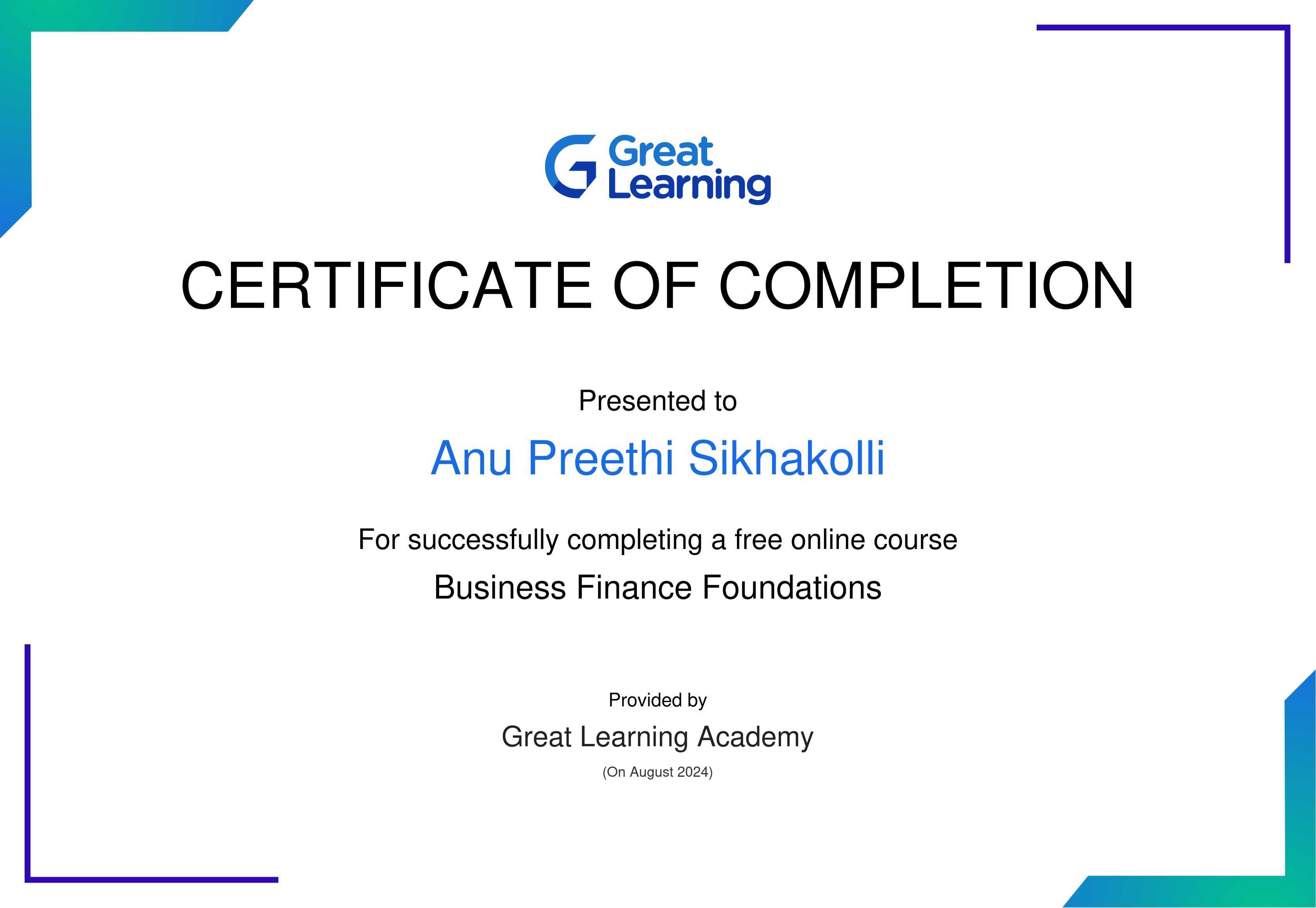 The certificate above verifies that Anu Preethi Sikhakolli has successfully completed the course Business Finance Foundations