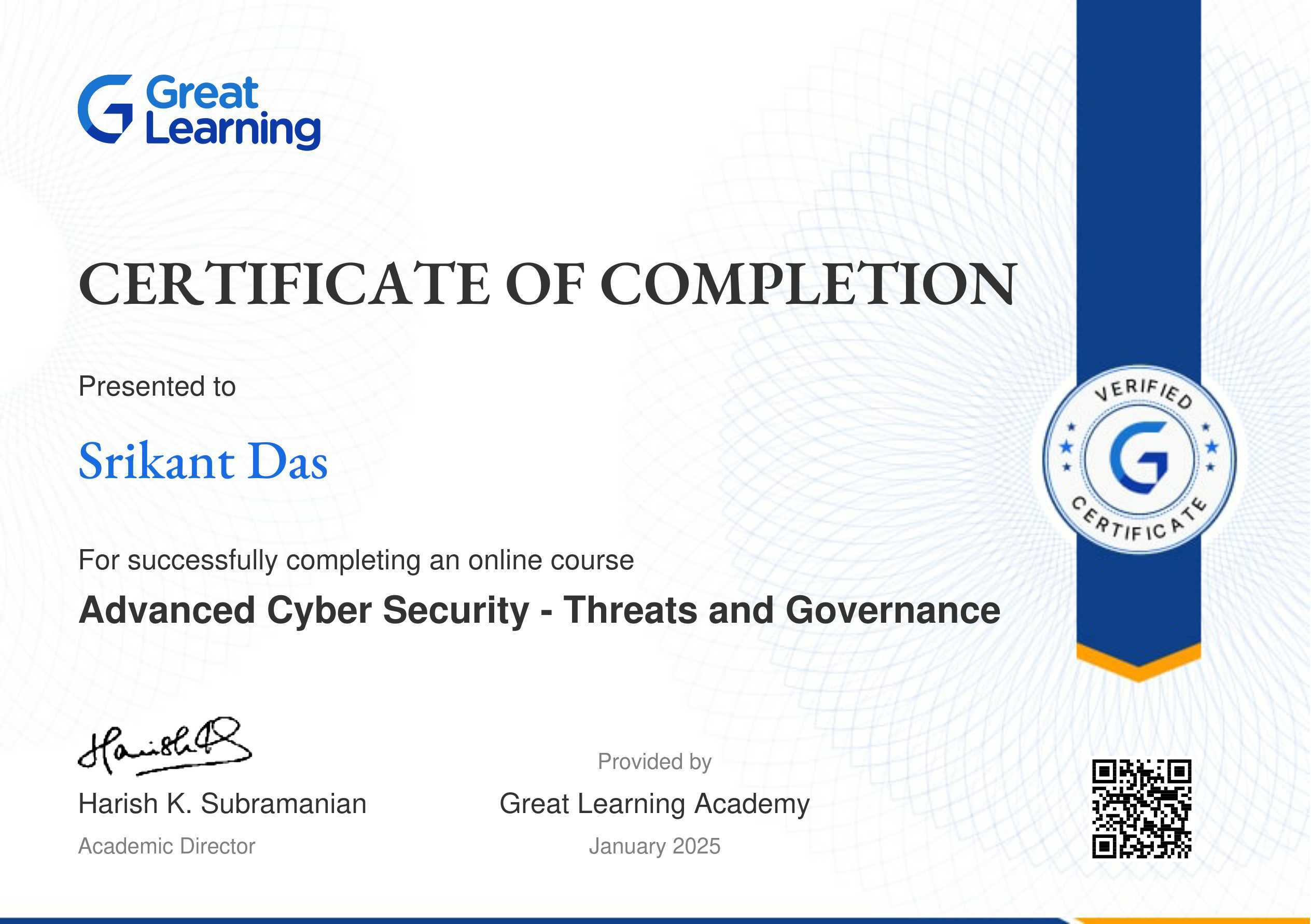 The certificate above verifies that Srikant Das has successfully completed the course Advanced Cyber Security - Threats and Governance