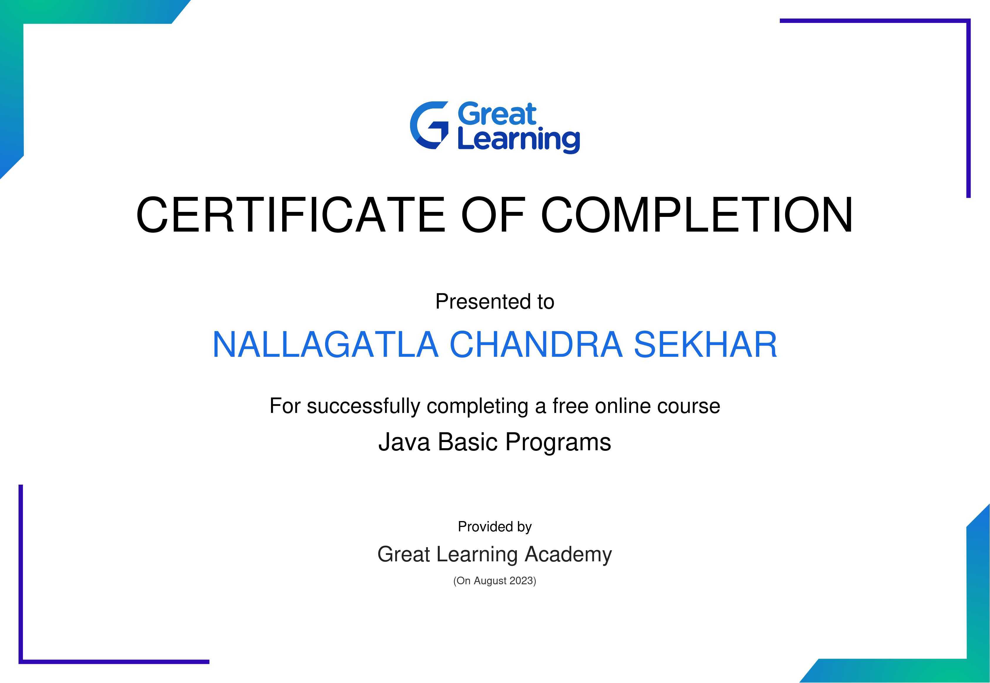The certificate above verifies that Nallagatla Chandra Sekhar has successfully completed the course Java Basic Programs