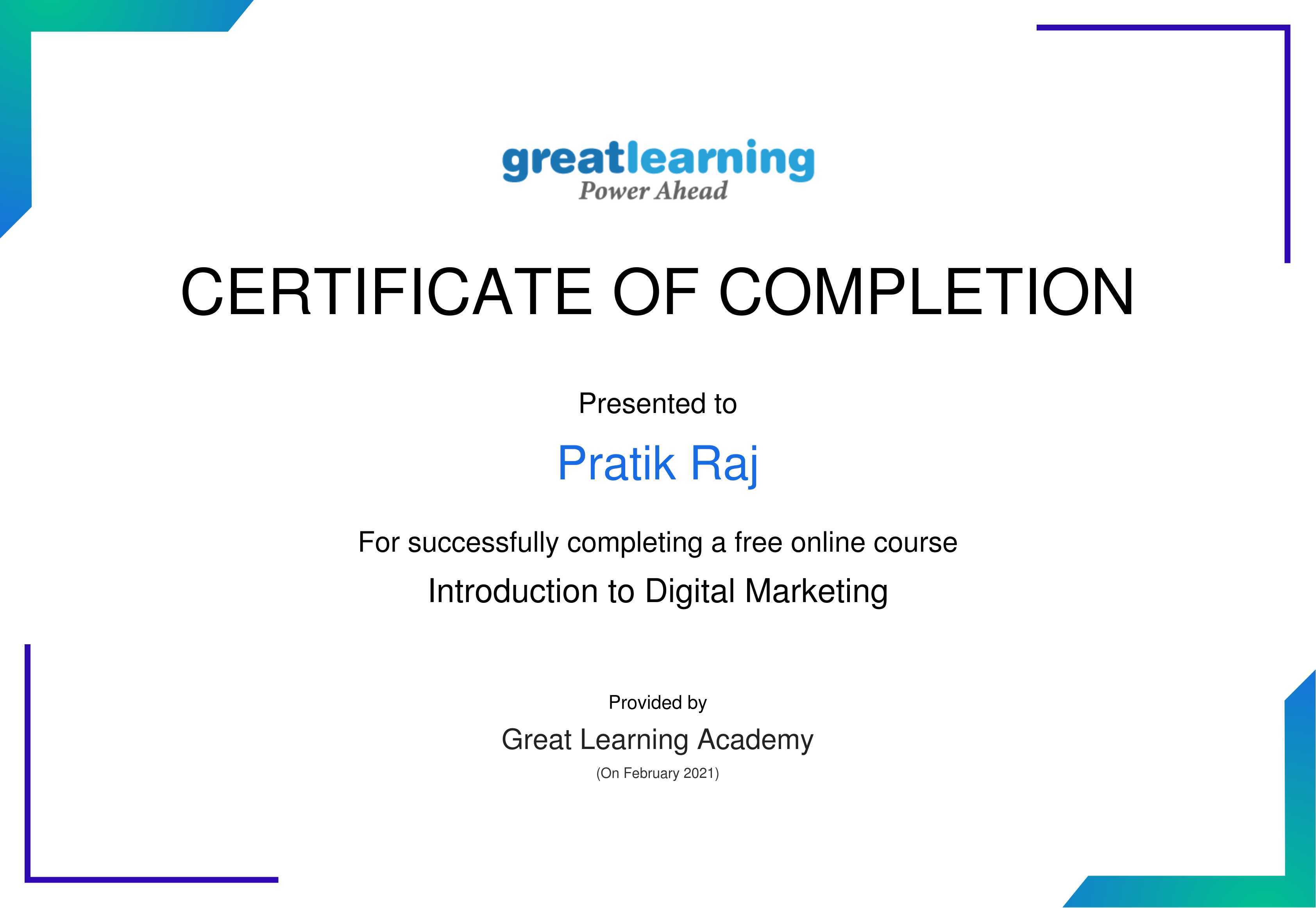 The certificate above verifies that Pratik Raj has successfully completed the course Introduction to Digital Marketing
