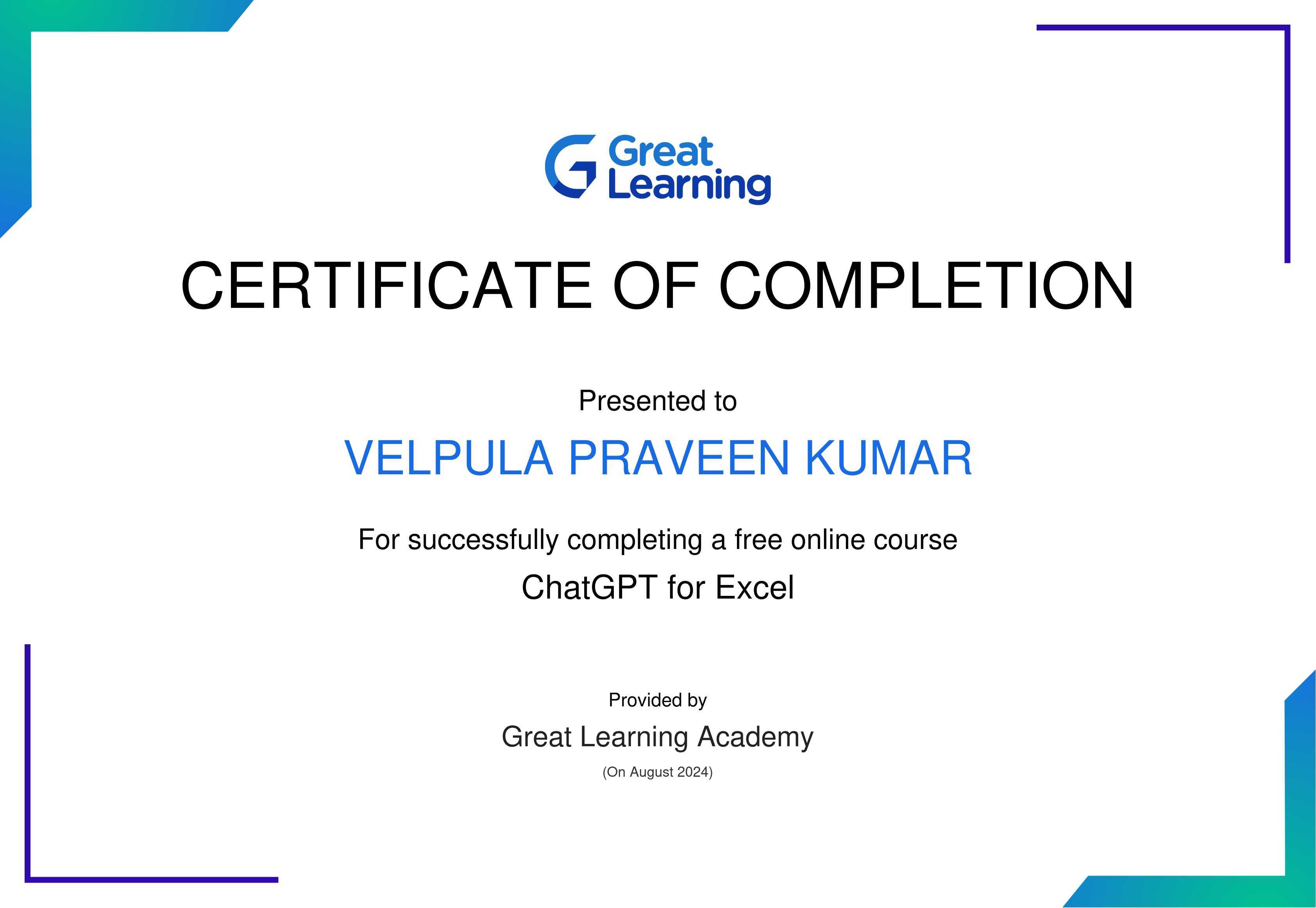 The certificate above verifies that Velpula Praveen Kumar has successfully completed the course ChatGPT for Excel