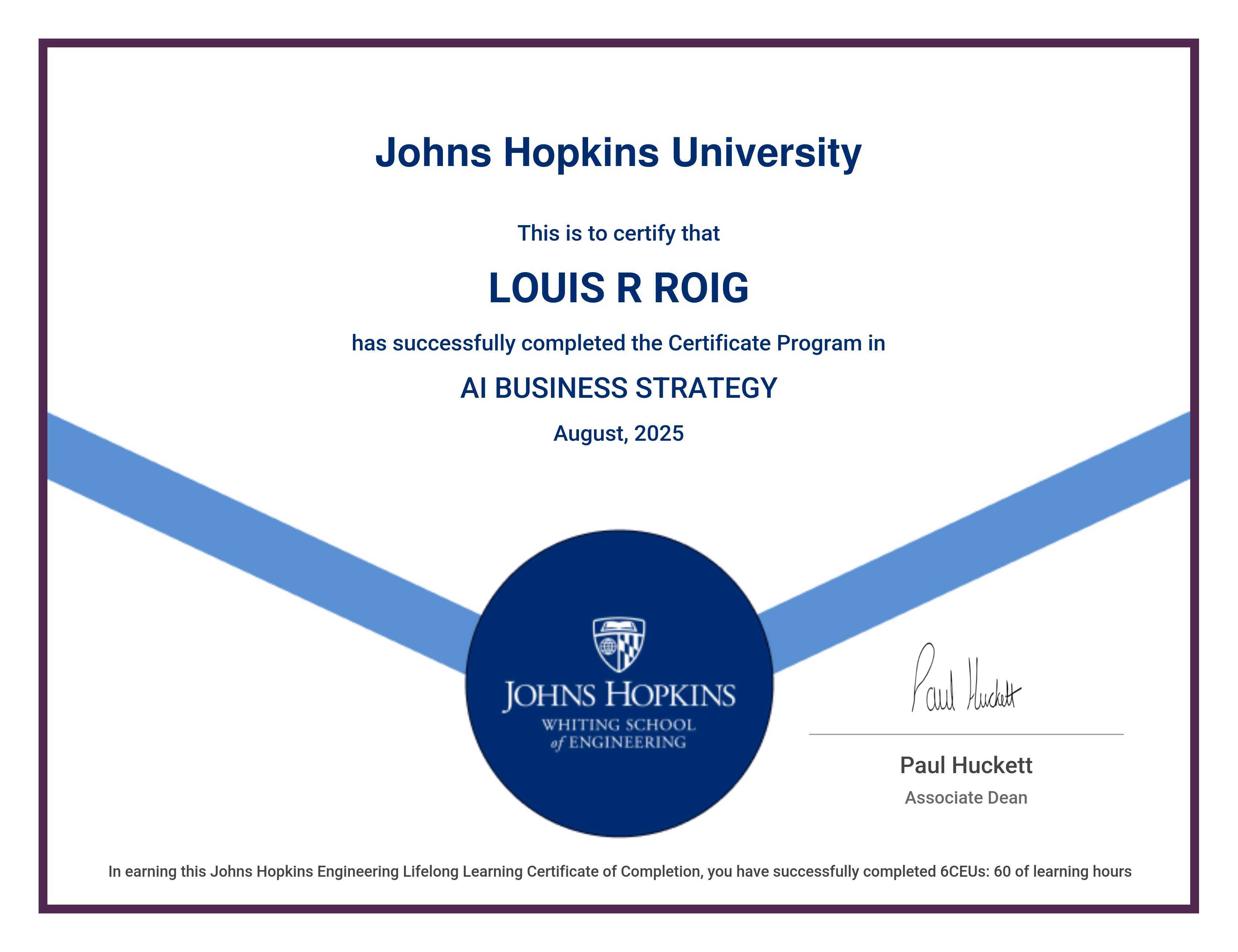 The certificate below verifies that LOUIS R ROIG has completed the AI BUSINESS STRATEGY