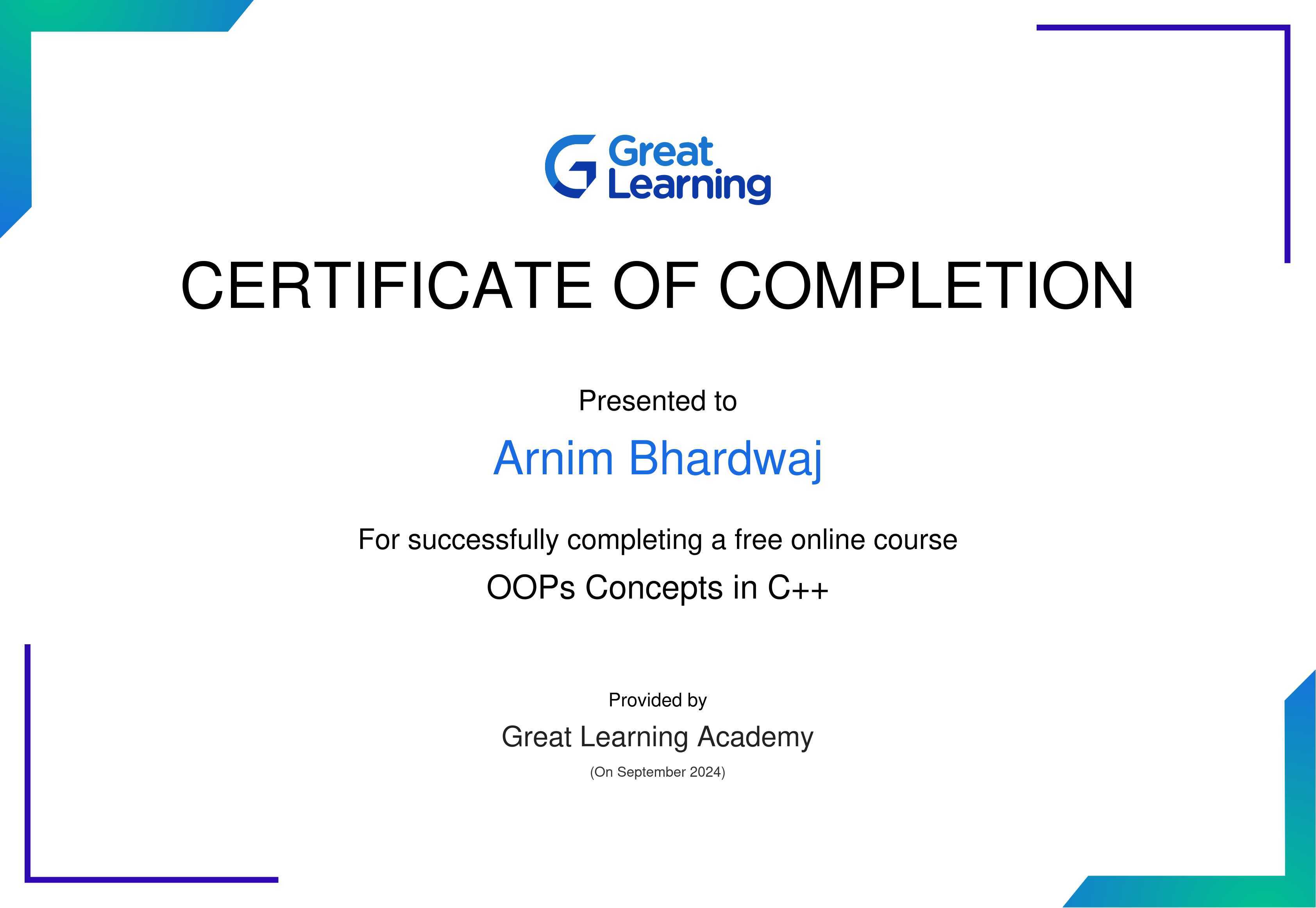 The certificate above verifies that Arnim Bhardwaj has successfully completed the course OOPs Concepts in C++