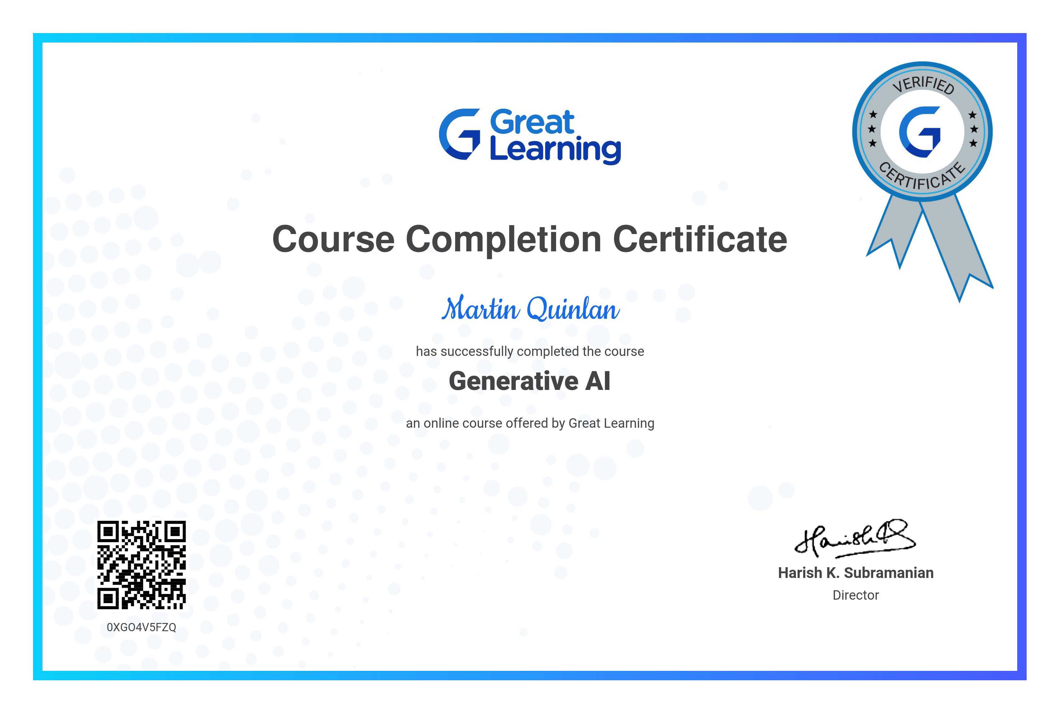 The certificate above verifies that Martin Quinlan has successfully completed the course Generative AI
