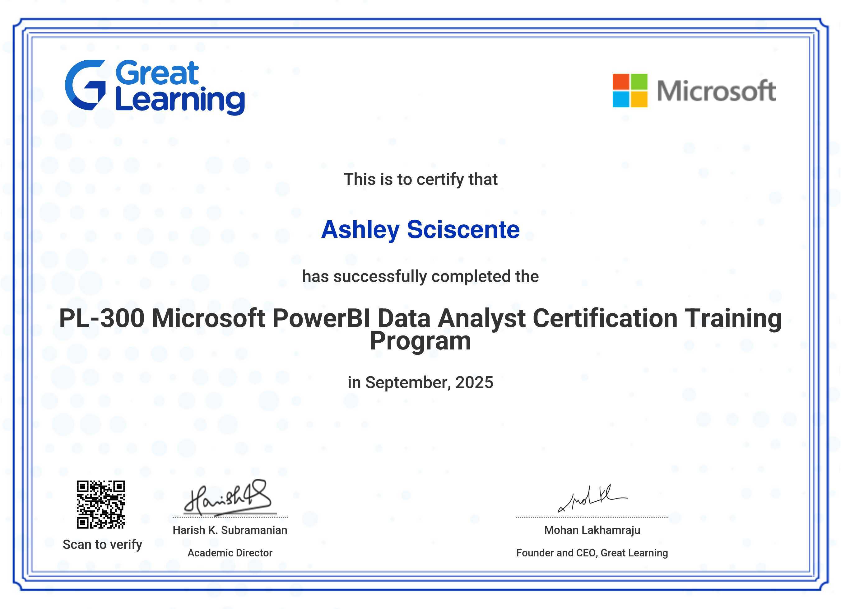 The certificate below verifies that ASHLEY SCISCENTE has completed the PL-300 MICROSOFT PowerBI DATA ANALYST CERTIFICATION TRAINING PROGRAM