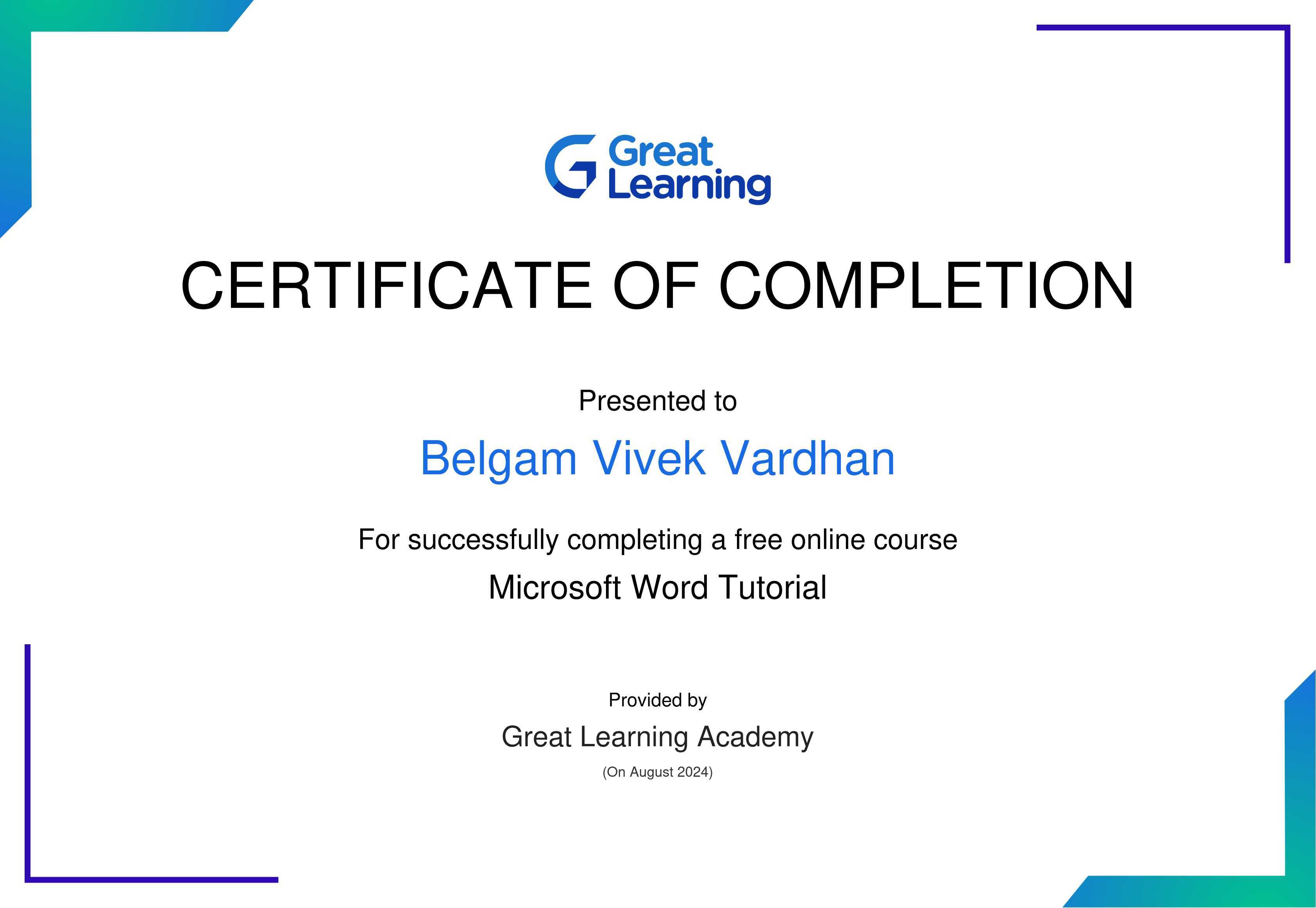 The certificate above verifies that Belgam Vivek Vardhan has successfully completed the course Microsoft Word Tutorial