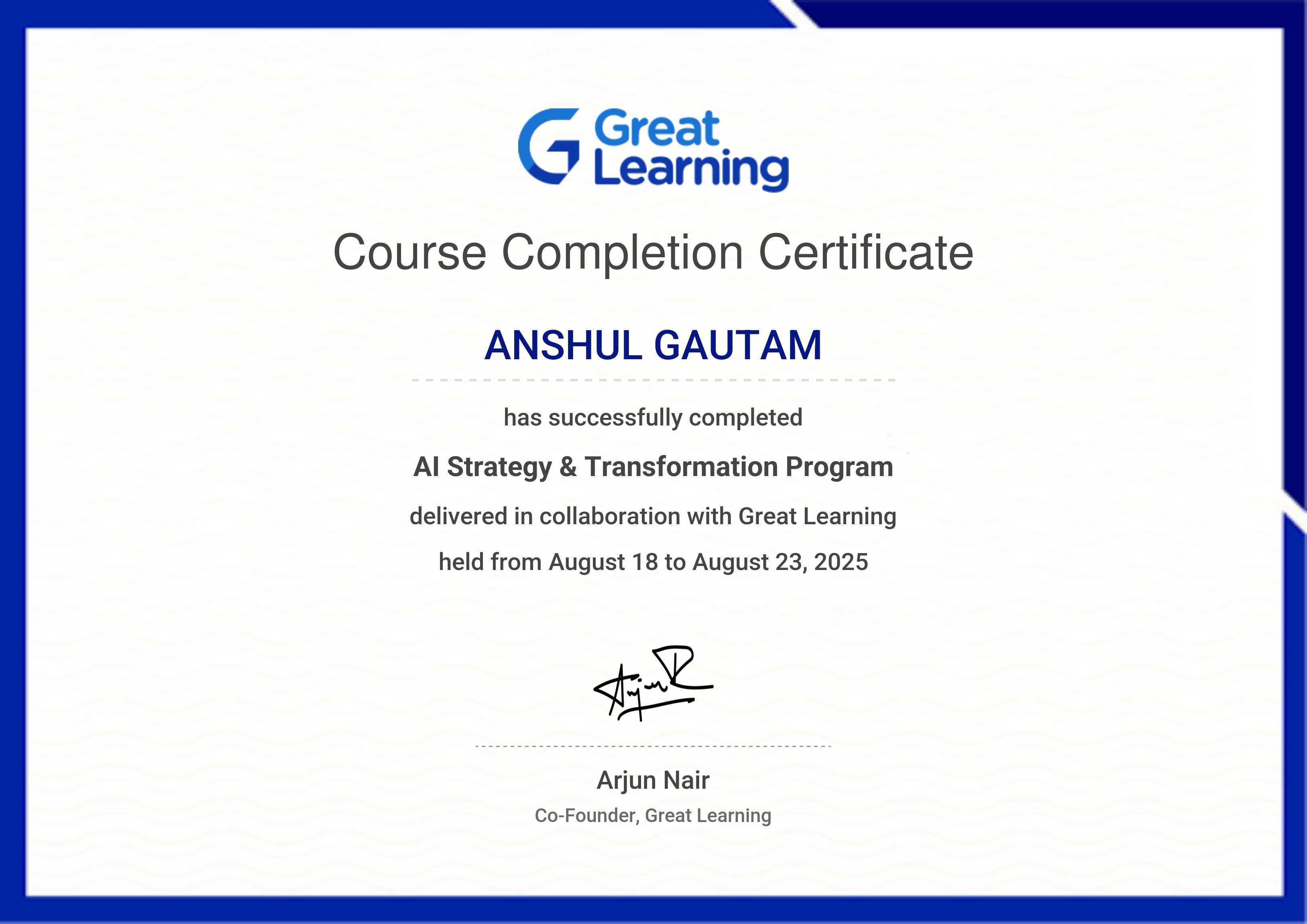 The certificate below verifies that ANSHUL GAUTAM has completed the AI Strategy & Transformation Program