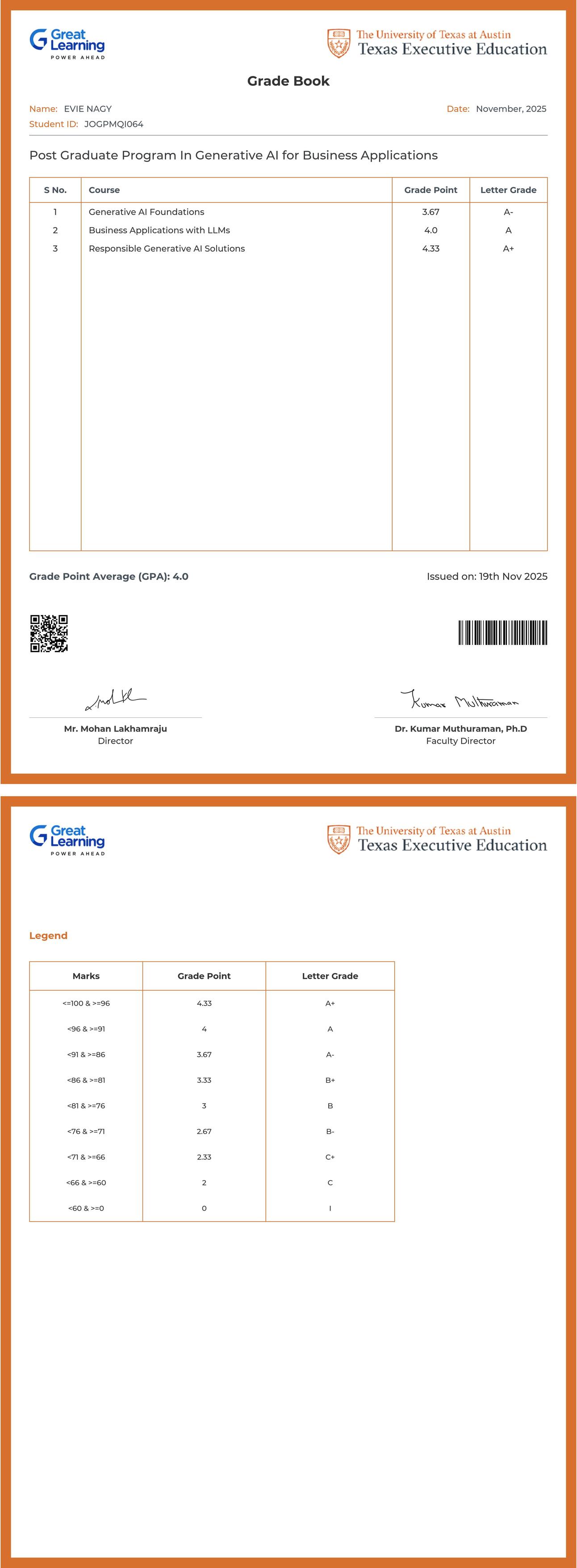 The grade sheet below verifies that EVIE NAGY has completed the POST GRADUATE PROGRAM IN GENERATIVE AI for BUSINESS APPLICATIONS