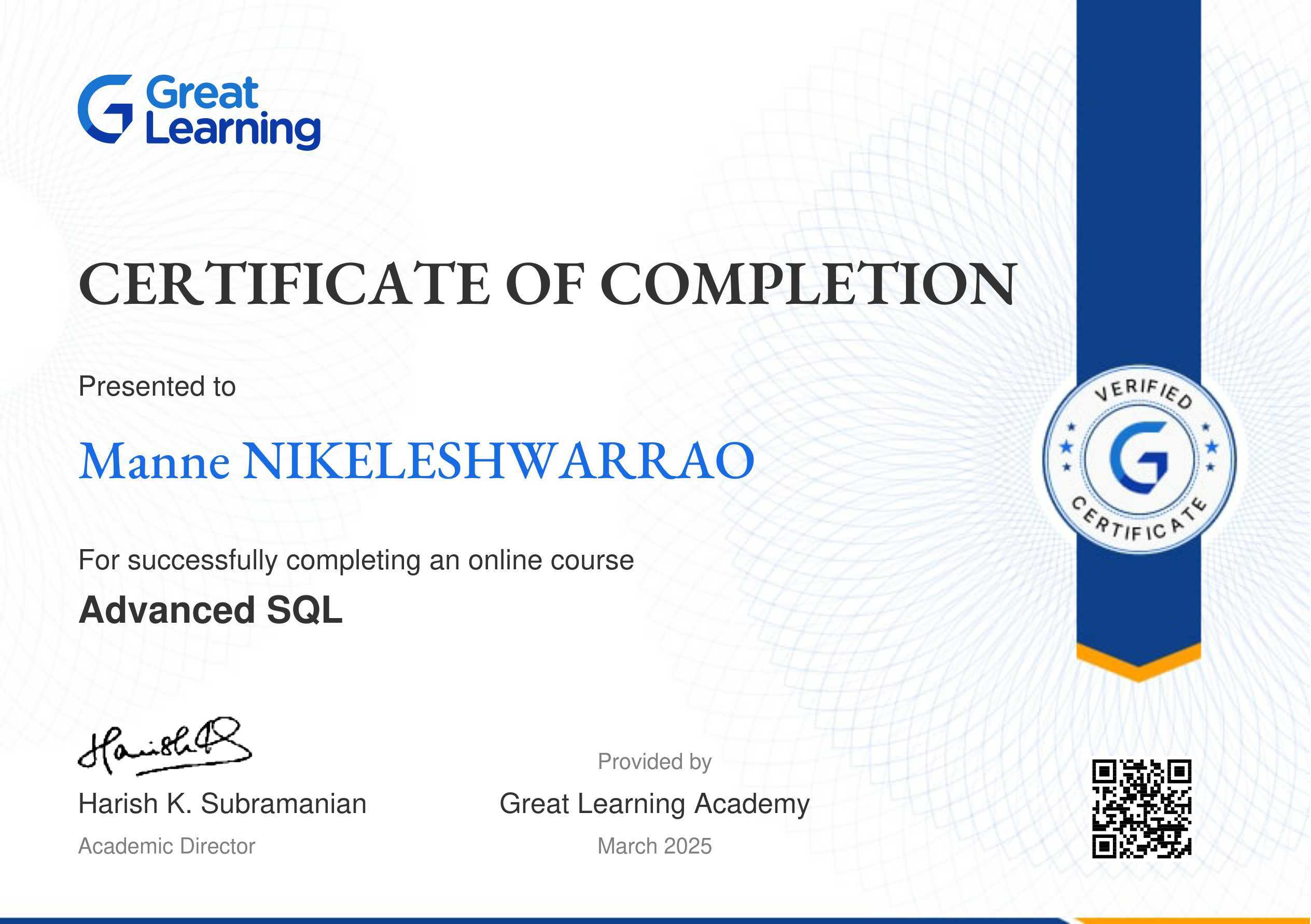 The certificate above verifies that Manne Nikeleshwarrao has successfully completed the course Advanced SQL