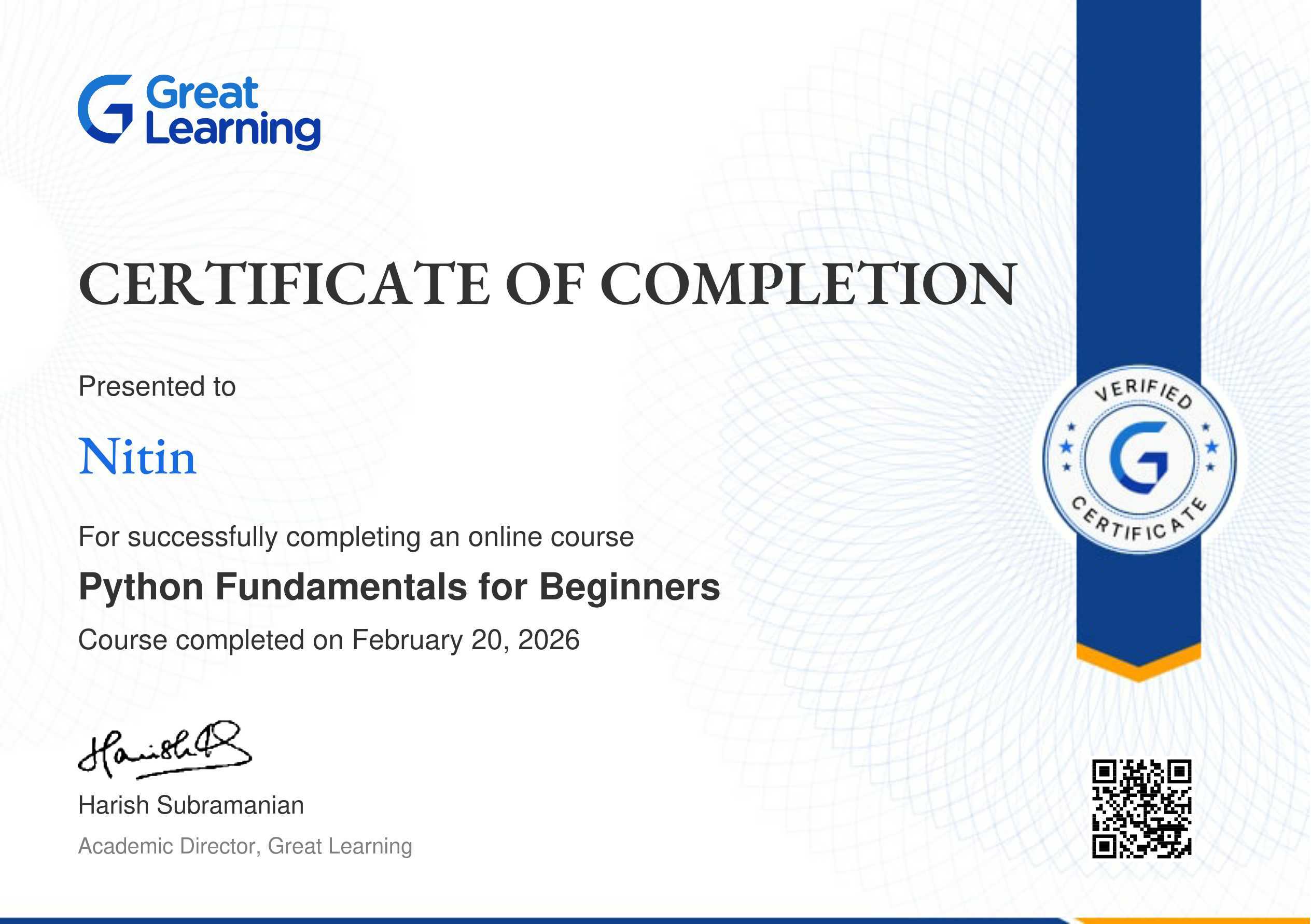 The certificate above verifies that Nitin has successfully completed the course Python Fundamentals for Beginners