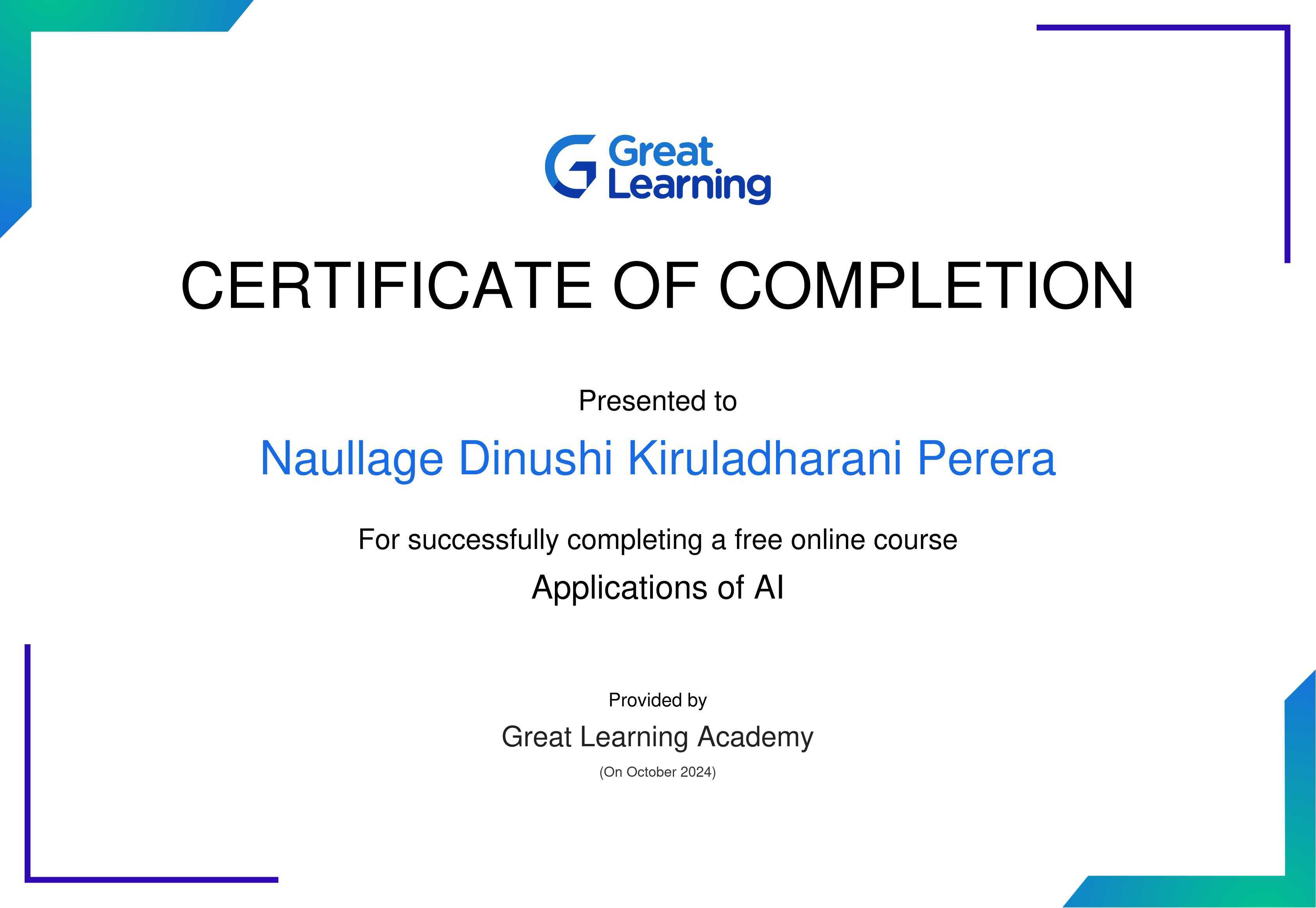 The certificate above verifies that Naullage Dinushi Kiruladharani Perera has successfully completed the course Applications of AI