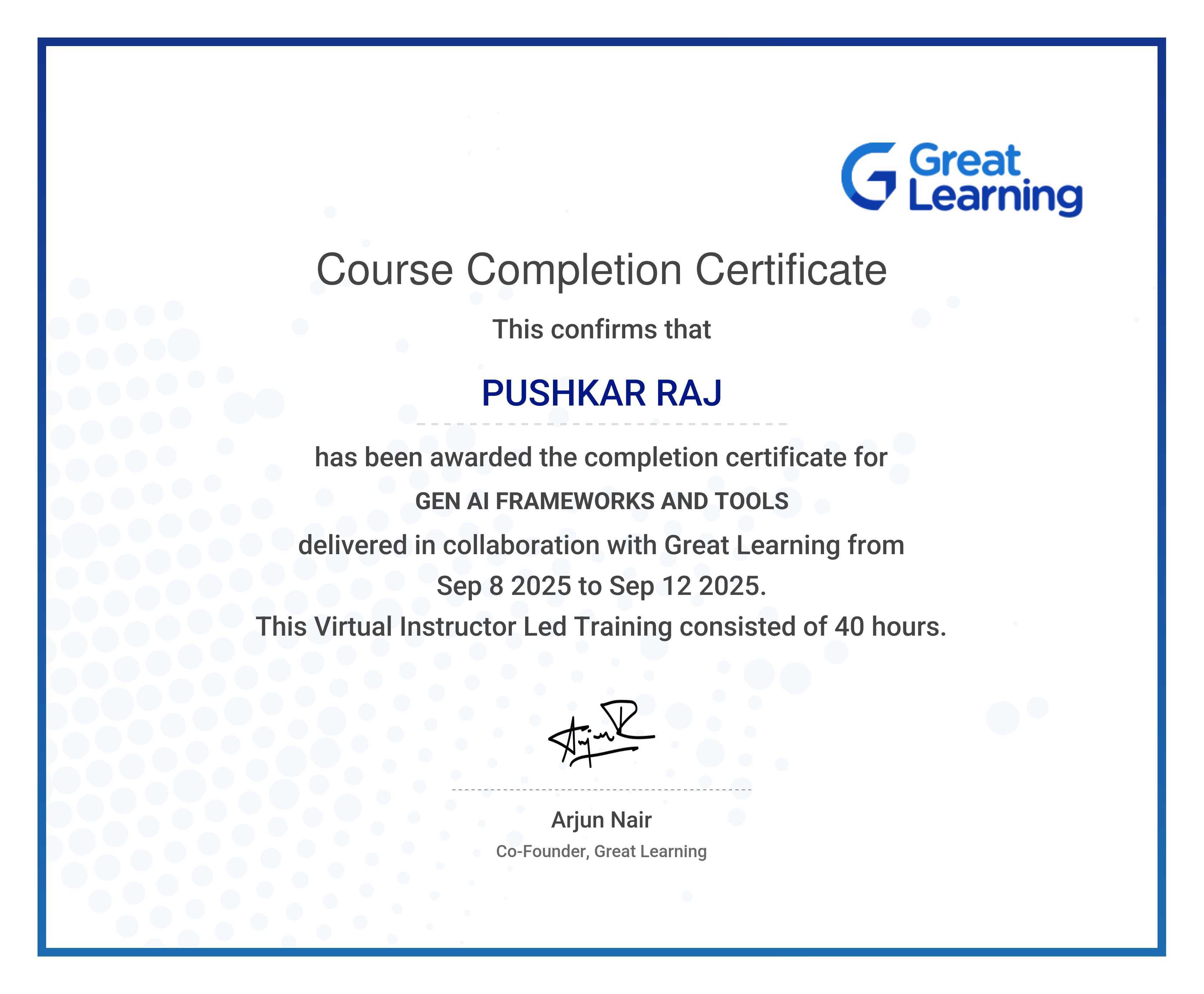 The certificate below verifies that PUSHKAR RAJ has completed the GEN AI FRAMEWORKS AND TOOLS