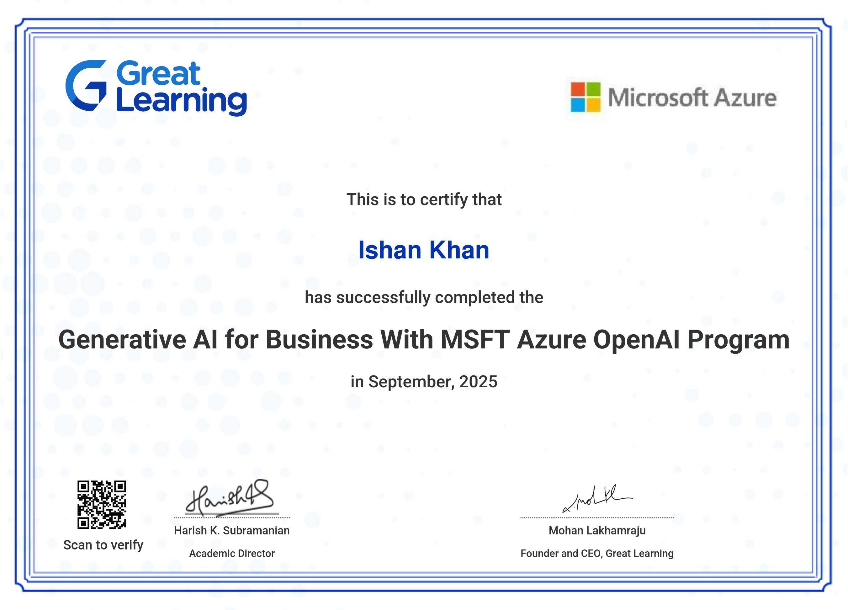 The certificate below verifies that ISHAN KHAN has completed the GENERATIVE AI for BUSINESS WITH MSFT AZURE OpenAI PROGRAM