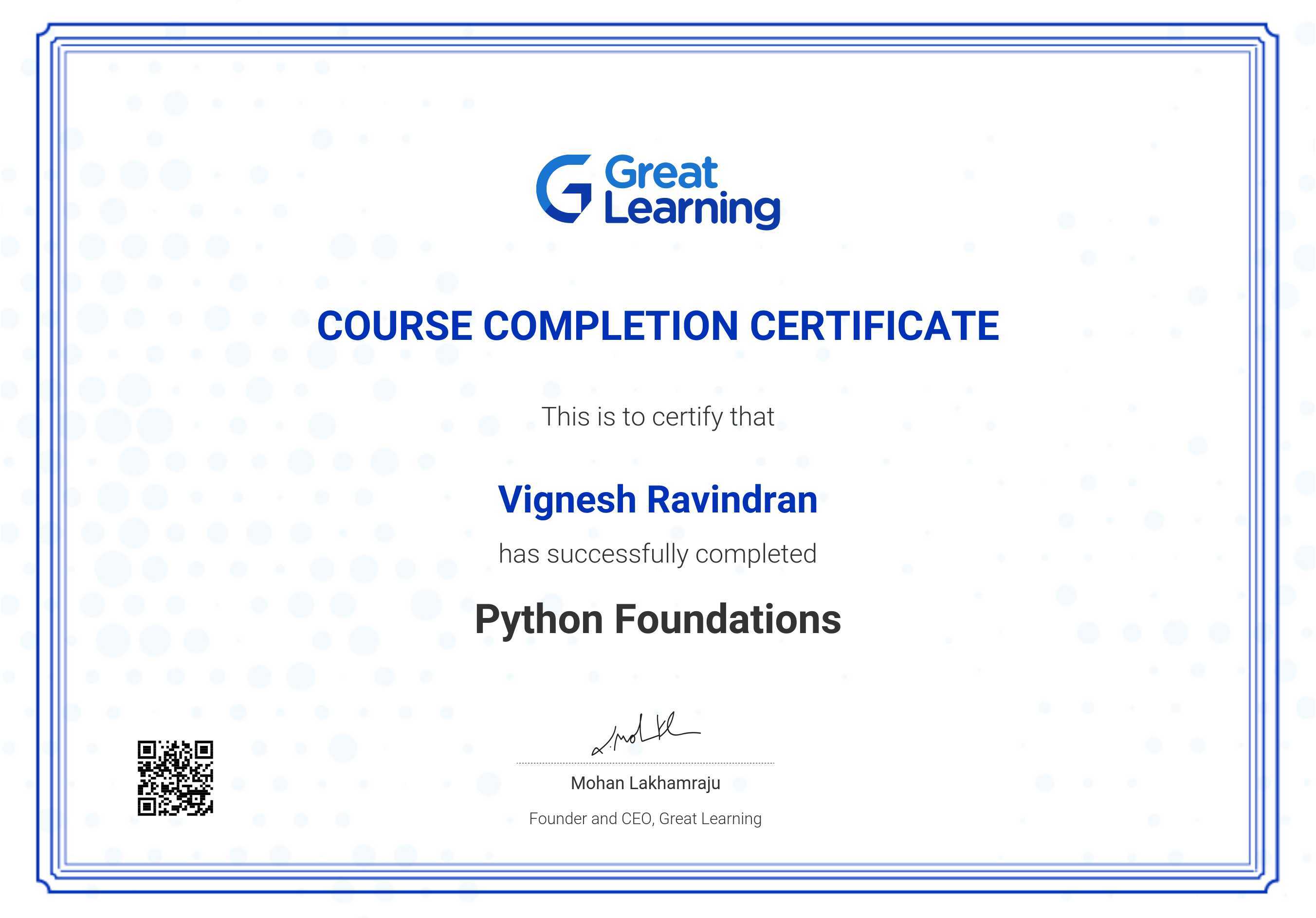 The certificate below verifies that Vignesh Ravindran has completed the Python Foundations course