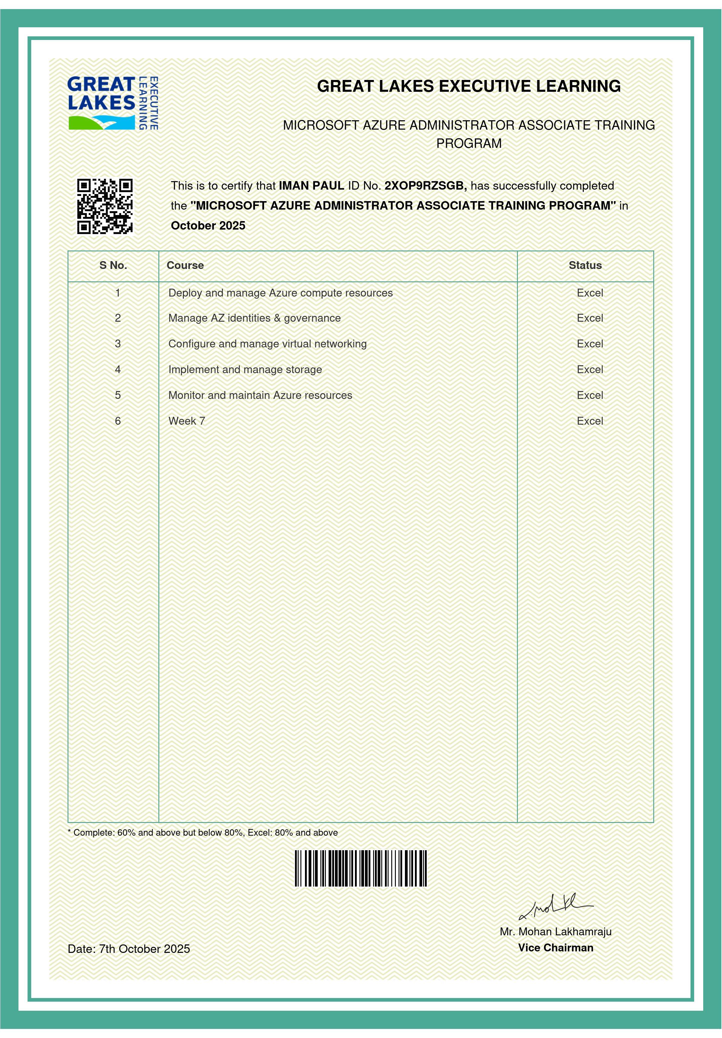 The transcript below verifies that IMAN PAUL has completed the MICROSOFT AZURE ADMINISTRATOR ASSOCIATE TRAINING PROGRAM