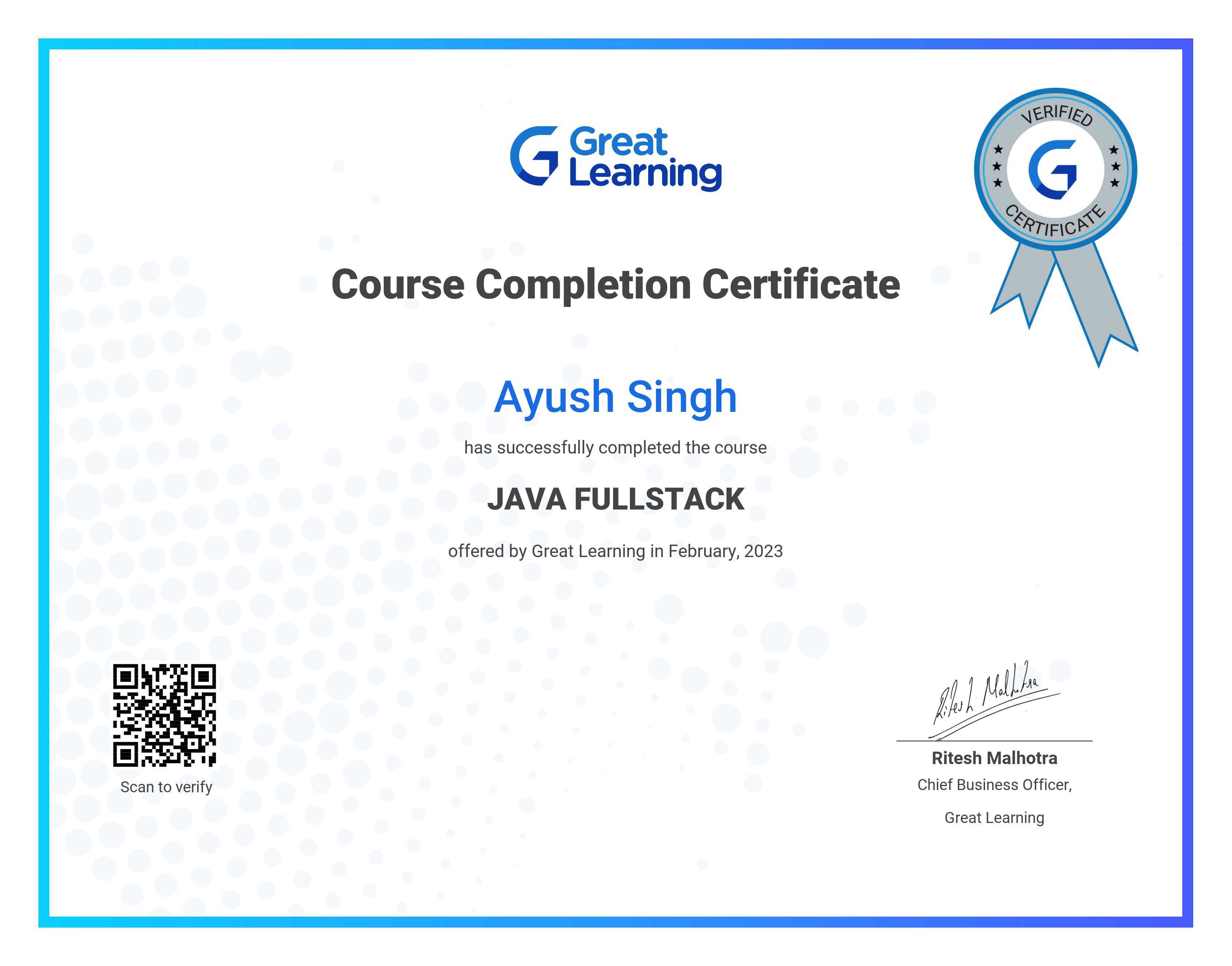 The certificate below verifies that AYUSH SINGH has completed the JAVA FULLSTACK