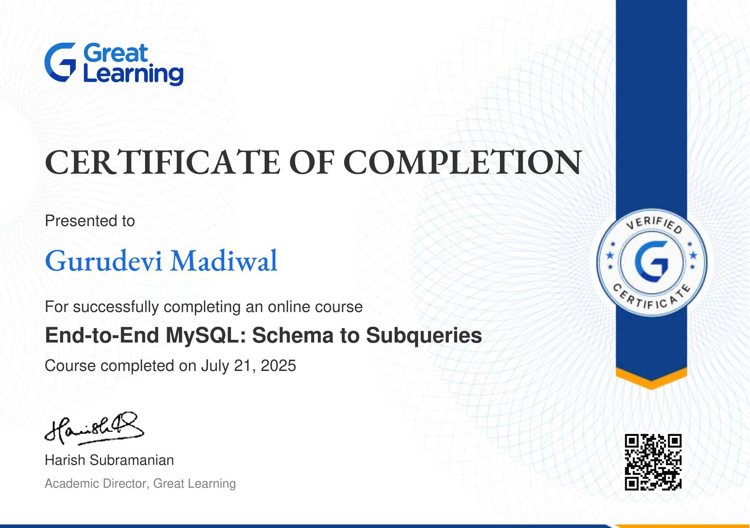 The certificate above verifies that Gurudevi Madiwal has successfully completed the course End-to-End MySQL: Schema to Subqueries