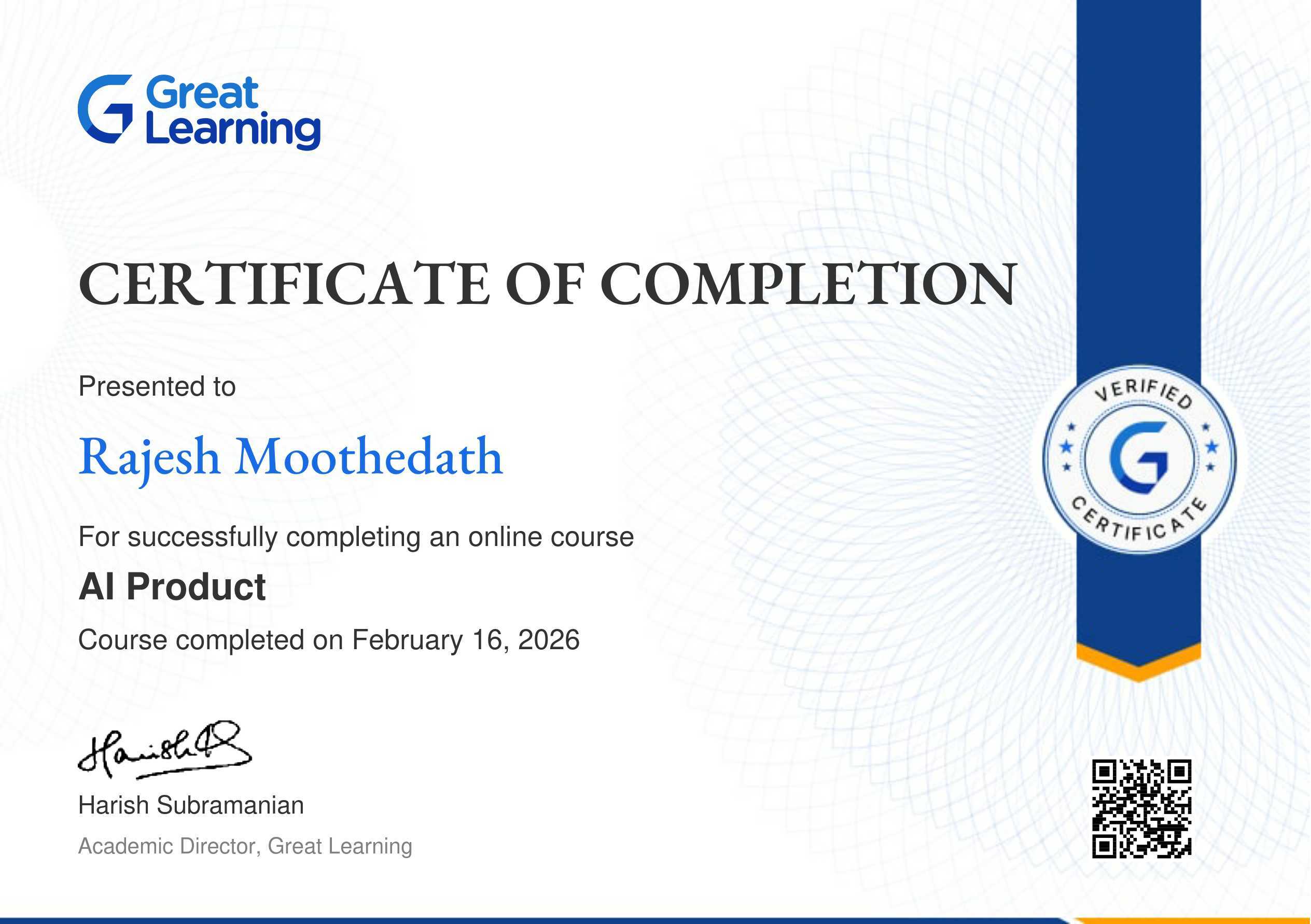The certificate above verifies that Rajesh Moothedath has successfully completed the course AI Product