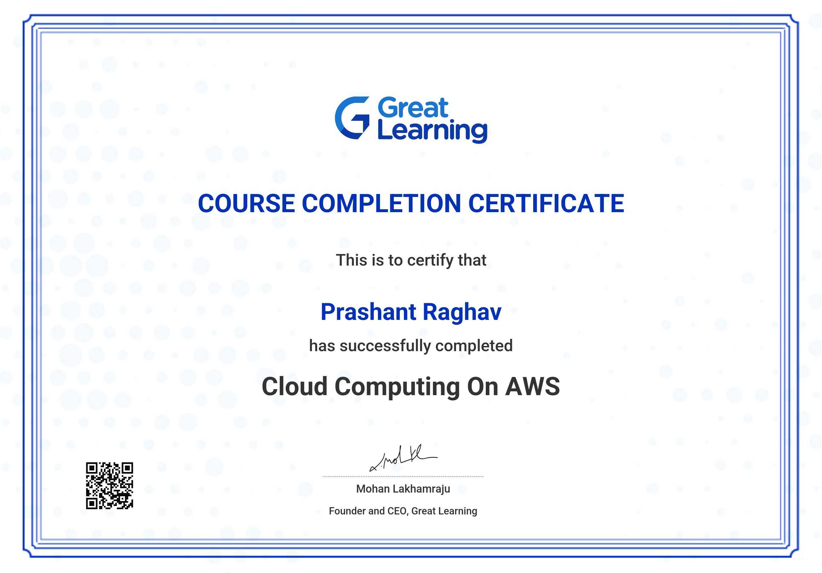 The certificate below verifies that Prashant Raghav has completed the Cloud Computing on AWS course