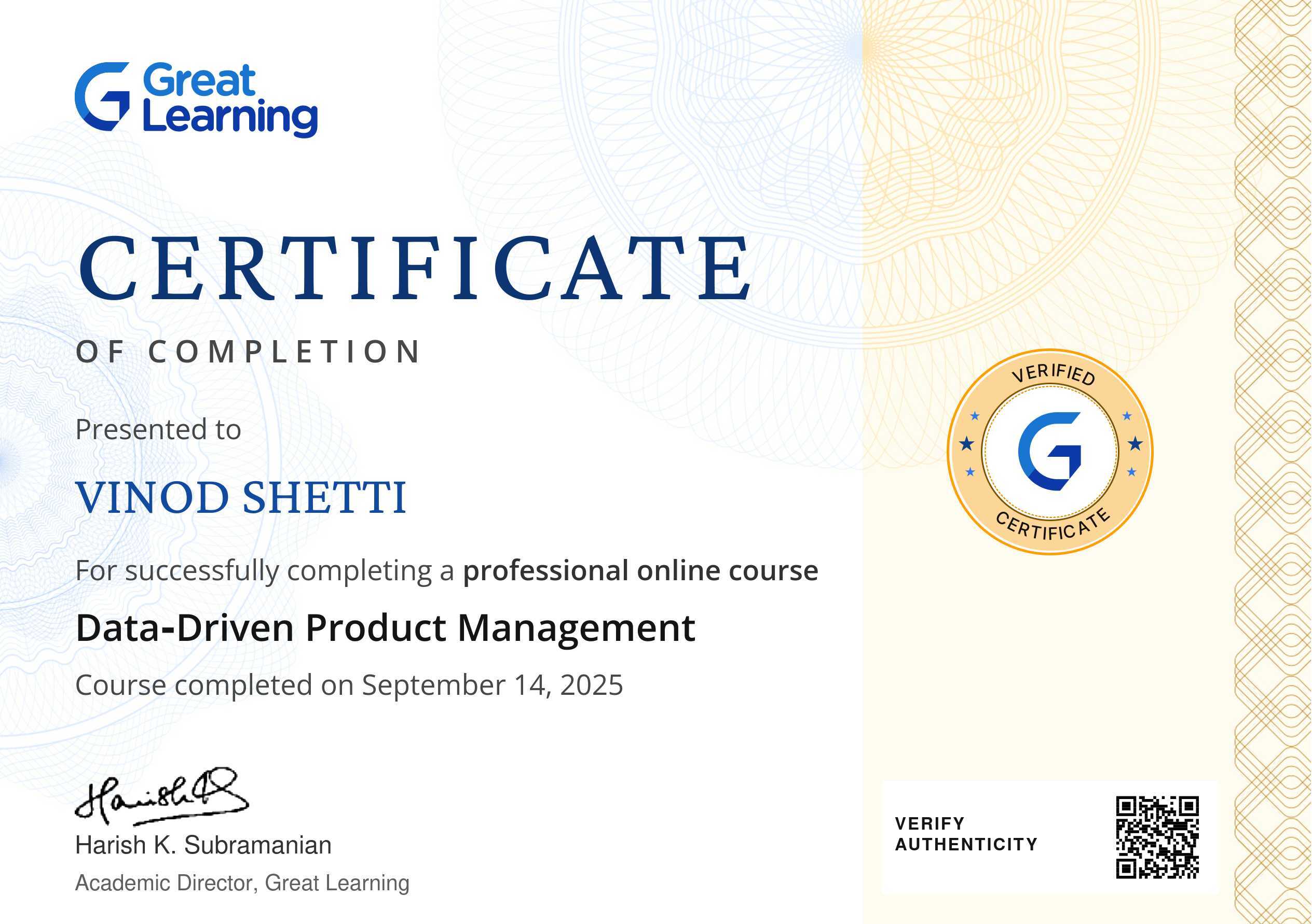 The certificate above verifies that Vinod Shetti has successfully completed the course Data‑Driven Product Management