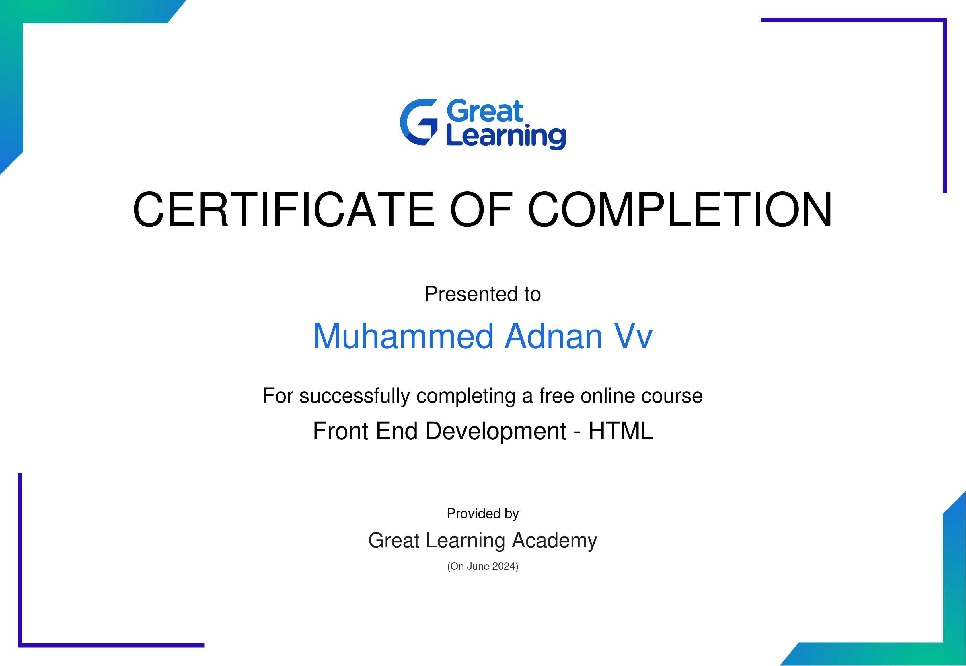 The certificate above verifies that Muhammed Adnan Vv has successfully completed the course Front End Development - HTML