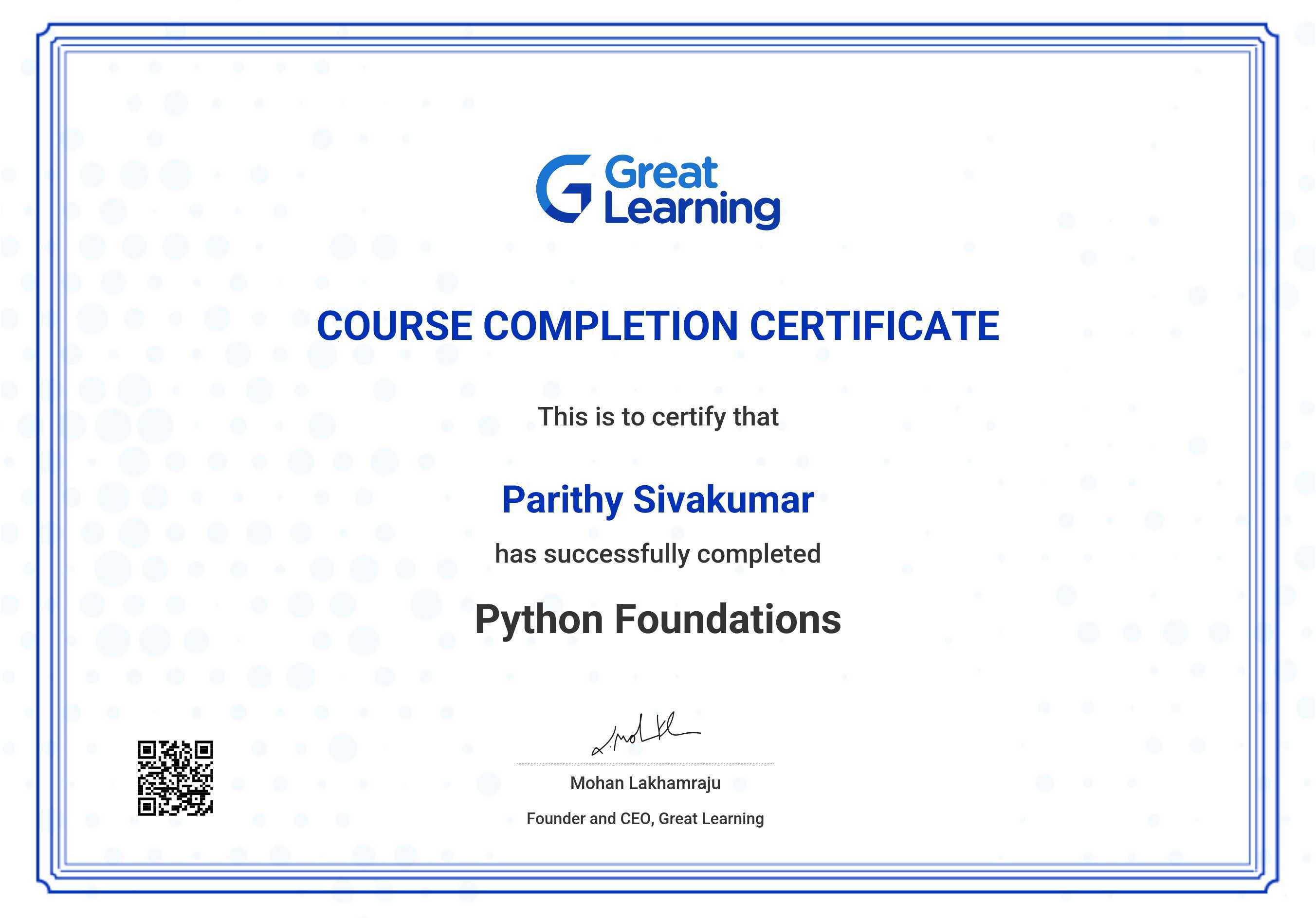 The certificate below verifies that Parithy Sivakumar has completed the Python Foundations course