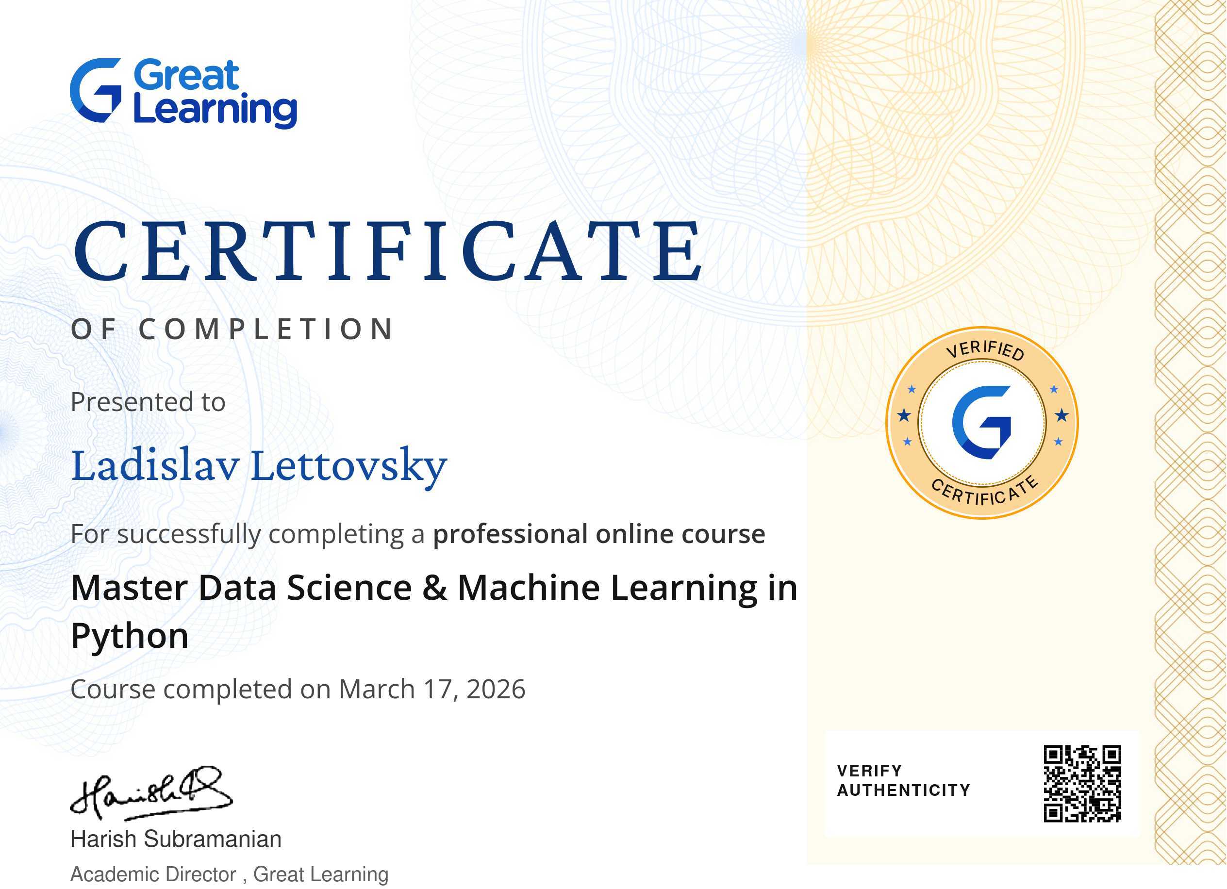 The certificate above verifies that Ladislav Lettovsky has successfully completed the course Master Data Science & Machine Learning in Python