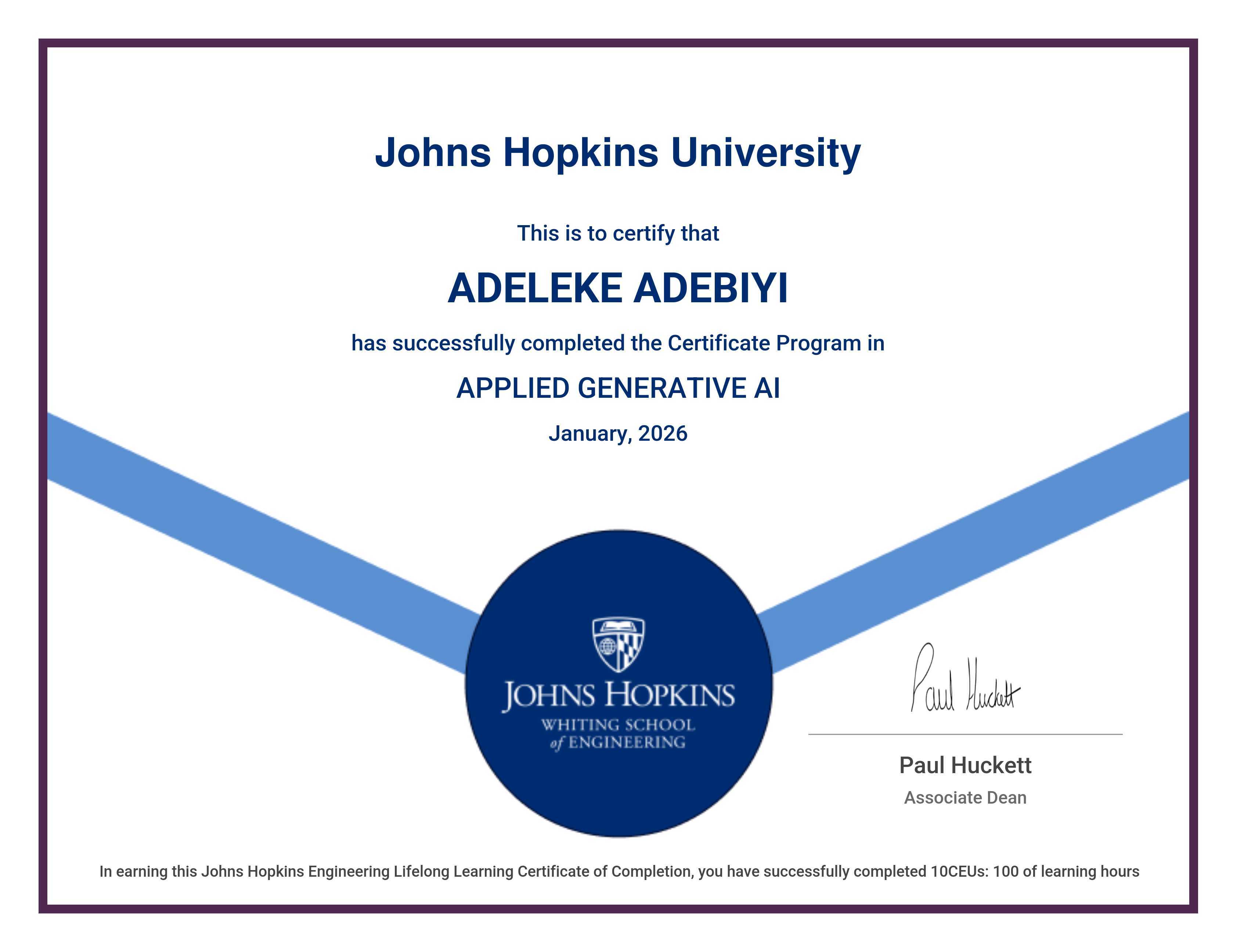 The certificate below verifies that ADELEKE ADEBIYI has completed the APPLIED GENERATIVE AI