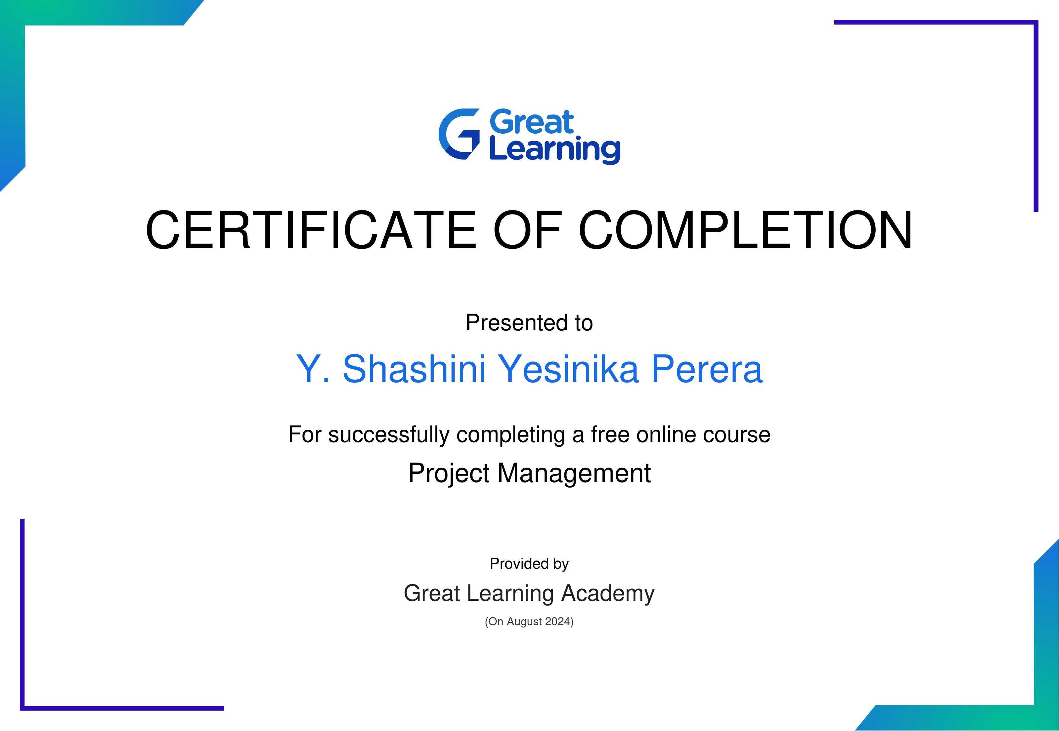 The certificate above verifies that Y. Shashini Yesinika Perera has successfully completed the course Project Management