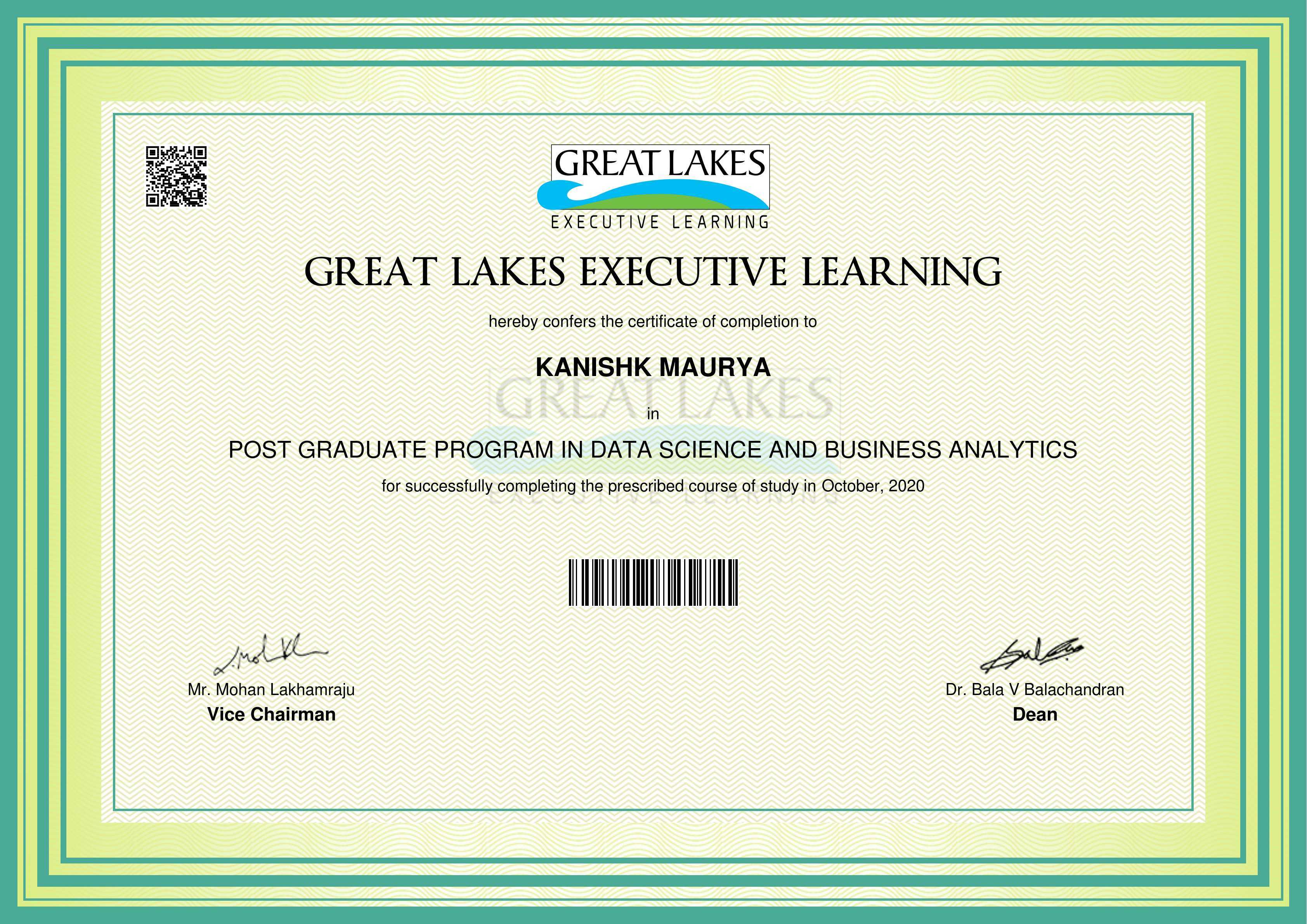 The certificate below verifies that KANISHK MAURYA has completed the POST GRADUATE PROGRAM IN DATA SCIENCE AND BUSINESS ANALYTICS