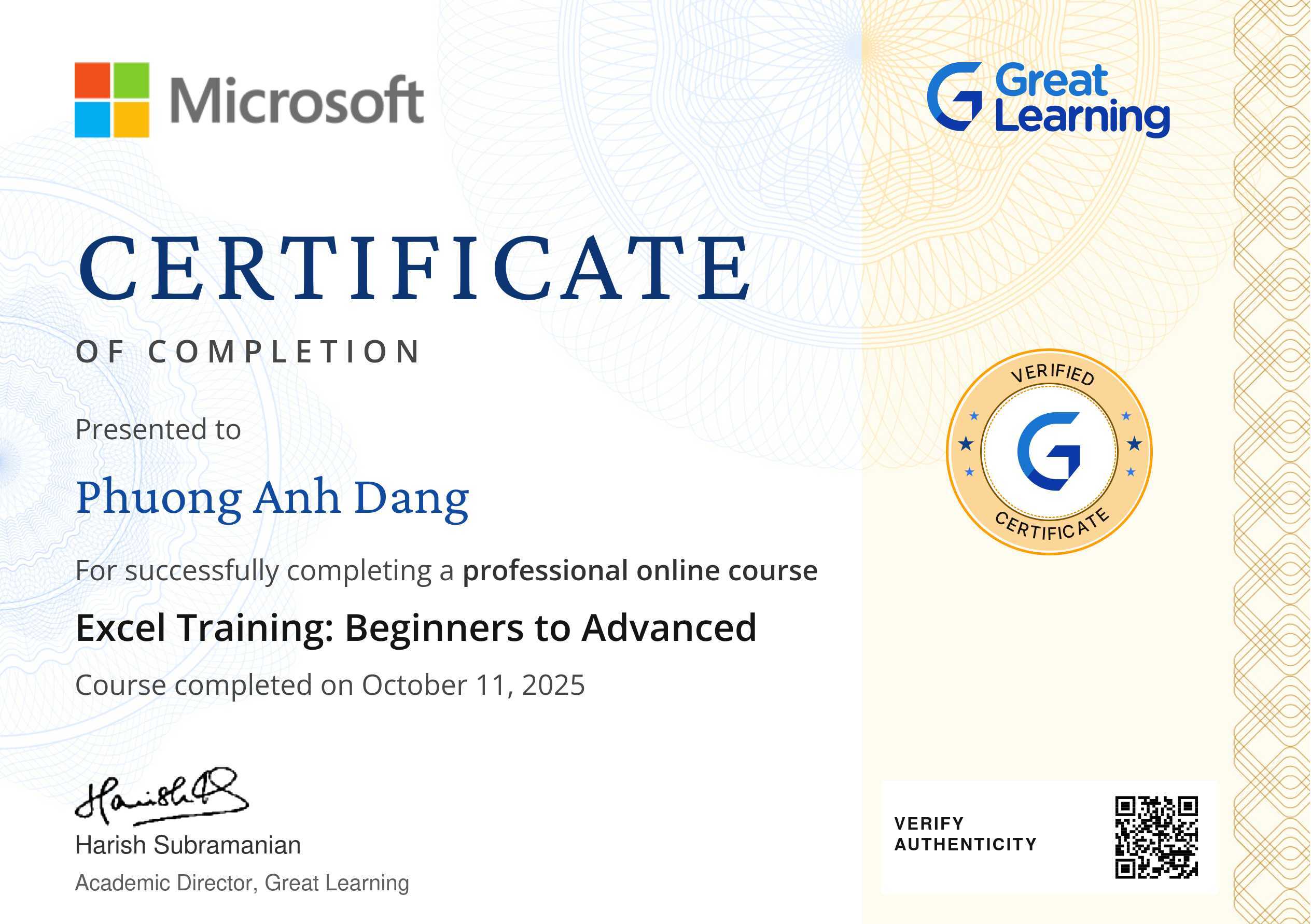The certificate above verifies that Phuong Anh Dang has successfully completed the course Excel Training: Beginners to Advanced